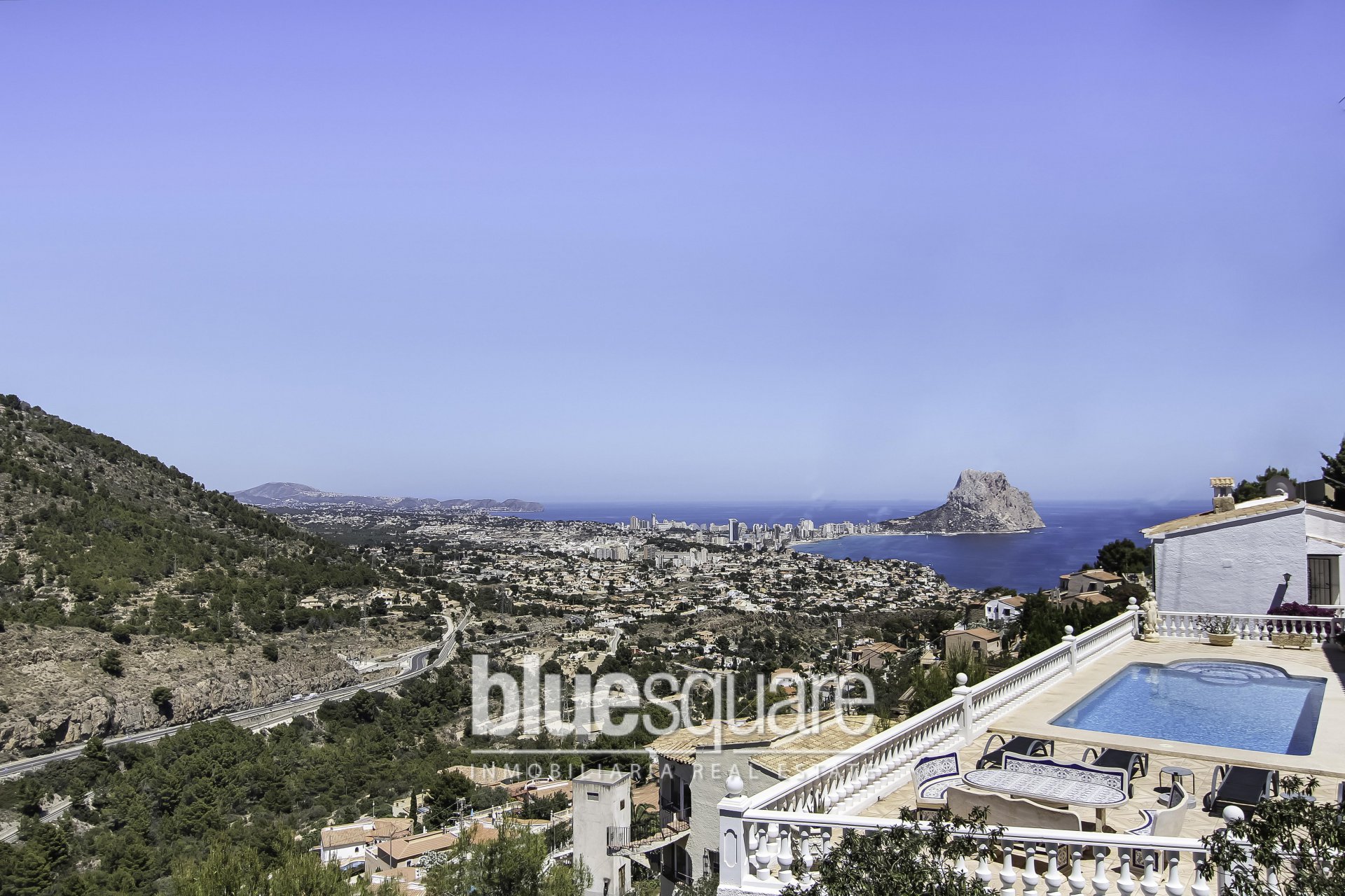 This beautifully renovated villa has wonderful panoramic views of Calpe bay & rock. This lovely villa is distributed over three levels with internal staircase and consists of 4 bedrooms with built in wardrobes & 3 bathrooms, large open plan kitchen dinner with stunning views from every window, very comfortable home cinema room and 2 terraces that boast panoramic sea views and over look the impressive 10×5 swimming pool. Ample gardens all round, summer kitchen & parking.