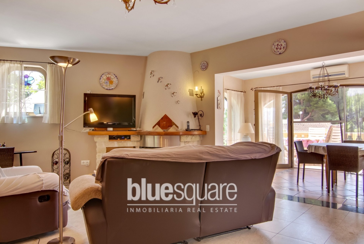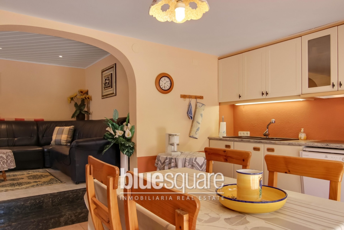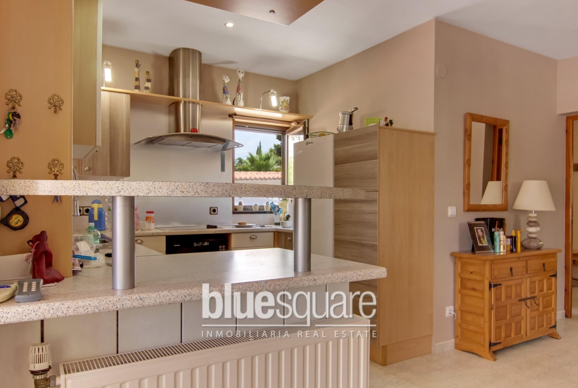 This villa is situated near Les Bassetes port and La Fustera sandy beach on a private plot of approximately 1000m2. A beautiful long driveway with electric gate leads to the 2 garages and the house. The property is divided in 2 separate levels. Each level has 2 spacious bedrooms and 2 bathrooms, living and dining area as well as a fully equipped kitchen. The upper level benefits from a large terrace which leads down to the swimming pool. The lower level has a covered terrace and a patio that directly leads to the nice swimming pool surrounded with terraces. There’s a nice garden with fruit trees.