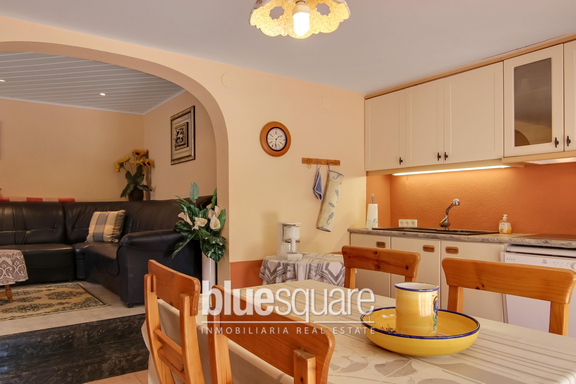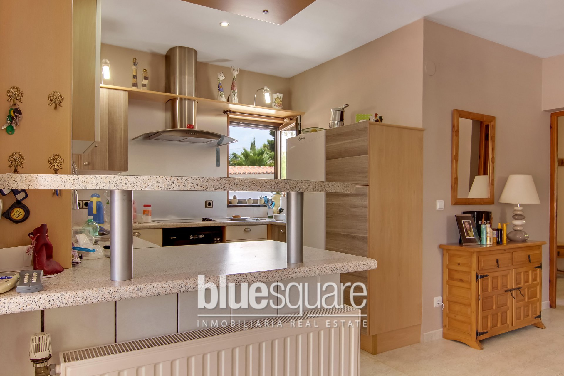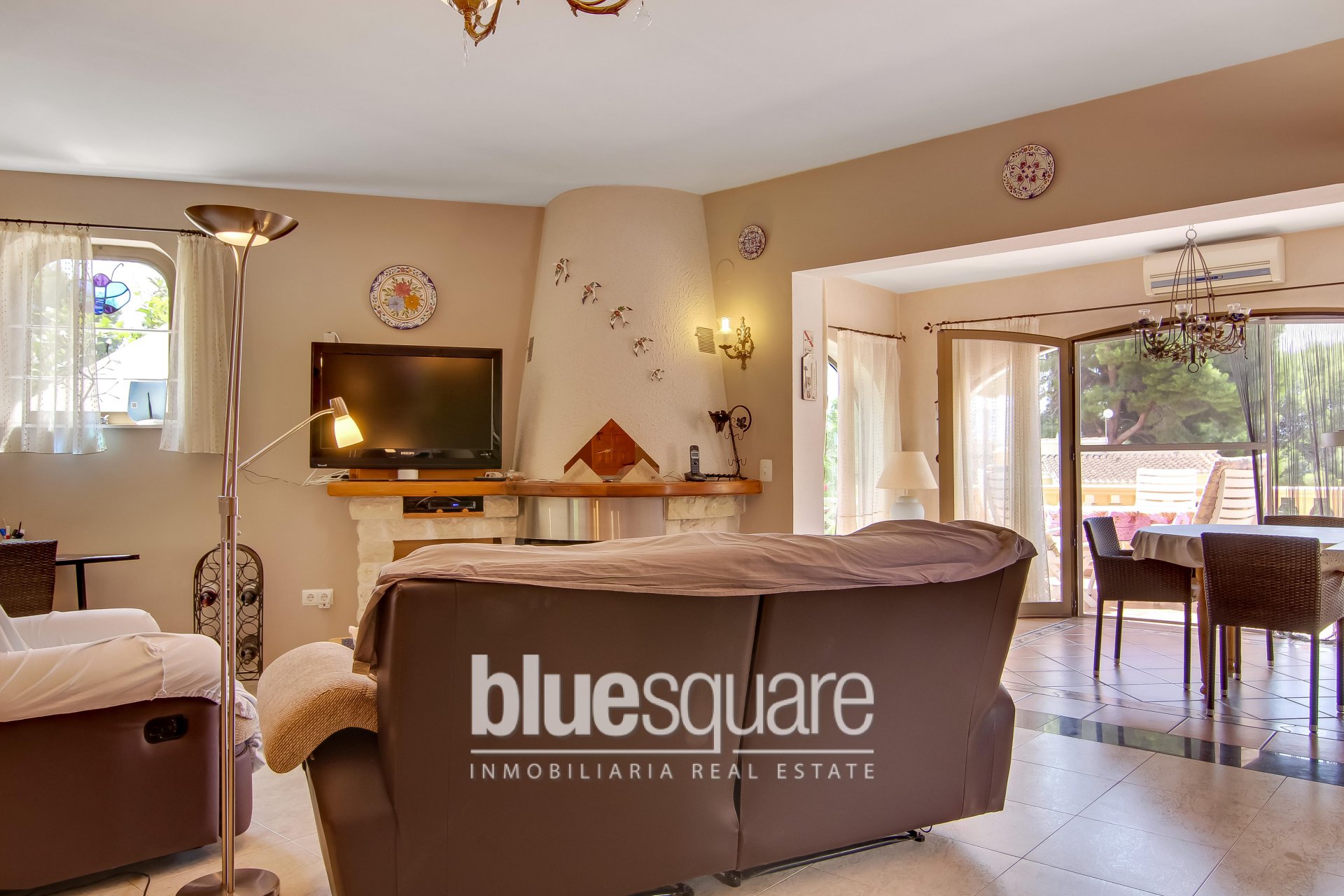 This villa is situated near Les Bassetes port and La Fustera sandy beach on a private plot of approximately 1000m2. A beautiful long driveway with electric gate leads to the 2 garages and the house. The property is divided in 2 separate levels. Each level has 2 spacious bedrooms and 2 bathrooms, living and dining area as well as a fully equipped kitchen. The upper level benefits from a large terrace which leads down to the swimming pool. The lower level has a covered terrace and a patio that directly leads to the nice swimming pool surrounded with terraces. There’s a nice garden with fruit trees.