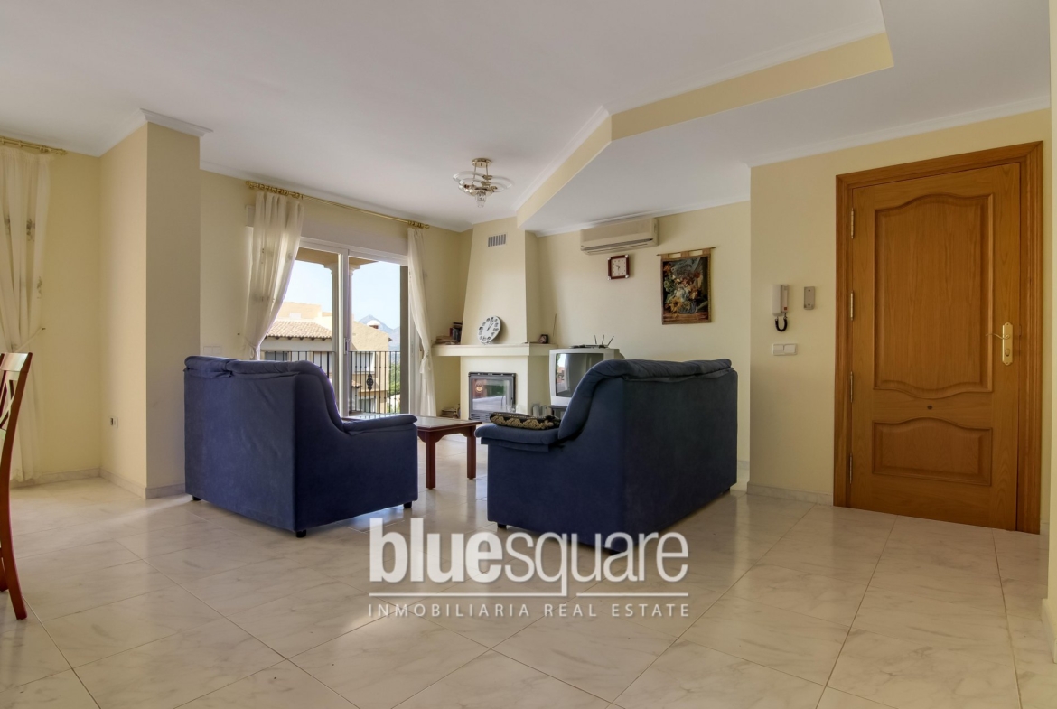 This townhouse is located in the quite area of Altea Hills with 24/7 security. On the first floor there is a nice living/dining area with a fireplace, open style kitchen and guest toilet. From the living/dining area you have access to a nice terrace. The second floor consists of a master bedroom with en-suite bathroom, two good size bedrooms and a bathroom. All the bedrooms have built in wardrobes. One of the bedrooms has access to a terrace with a slight sea view. On the street level there is a garage with some extra space ready to be developed. The communal swimming pool is only steps away.