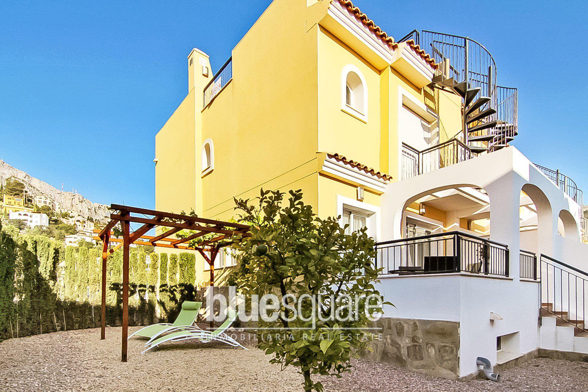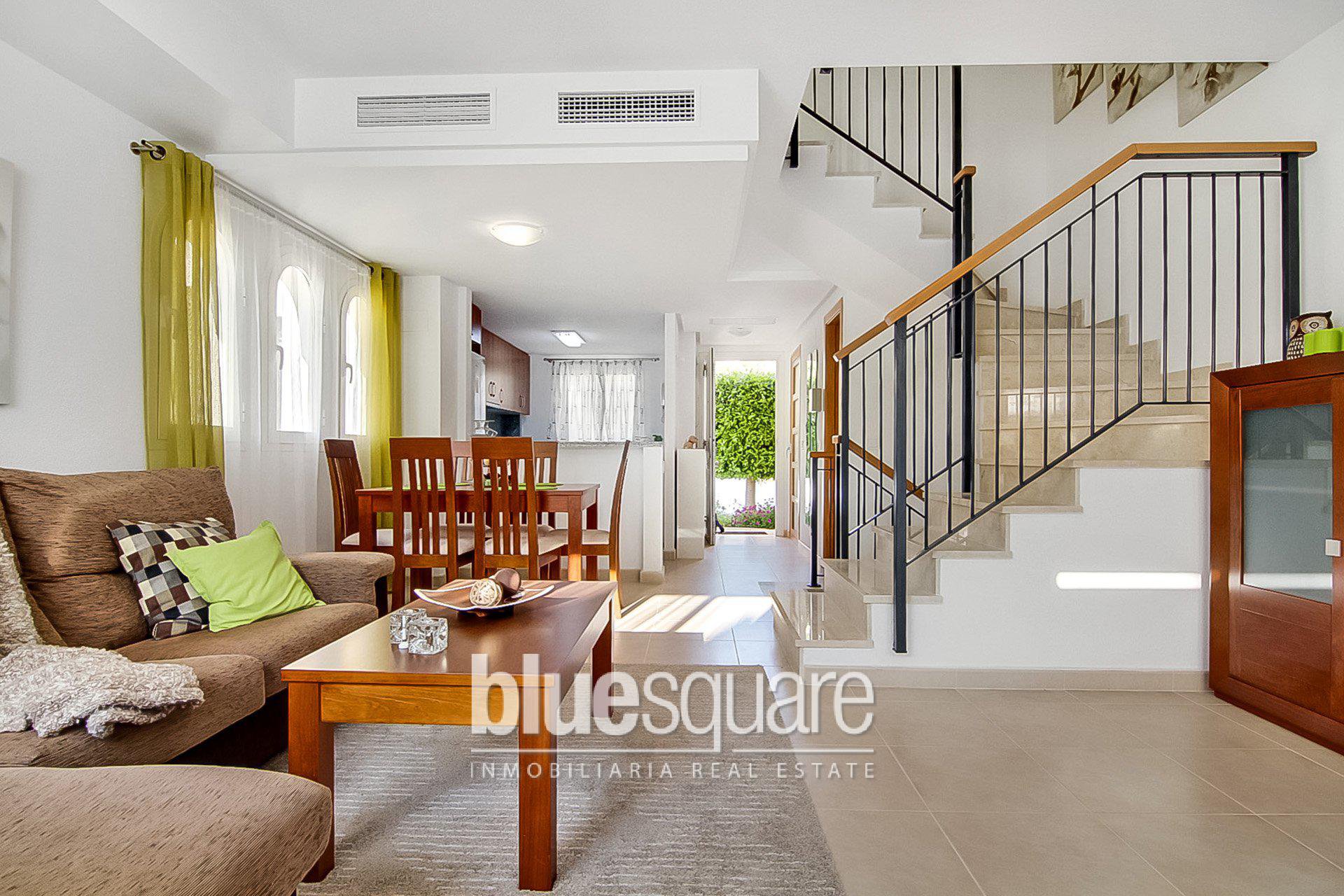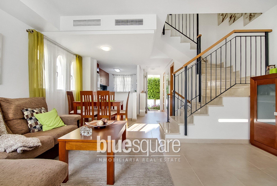 This lovely 2-bedroom town house sits in a quiet urbanization with communal swimming pool & gardens. The property is distributed over 3 floors, with the main floor consisting of a living/dining room, self-contained kitchen, guest bathroom, a terrace and a garden area with bbq. The upper floor has 2 bedrooms & 2 bathrooms with one en-suite and a staircase that leads to the roof solarium, which boasts panoramic views of the coastline and el Penon d’Ifach. The lower floor has a home cinema room and a very large exercise room, which could easily be converted, into an extra bedroom if one desired. The property comes with a covered parking and completely furnished.