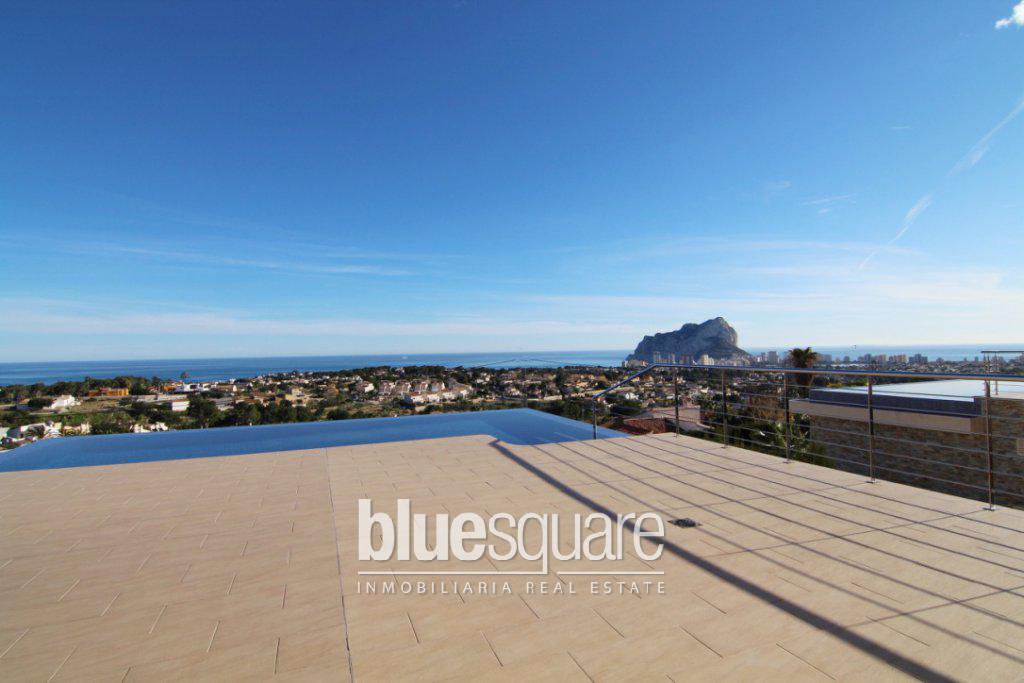 This amazing and luxury villa provides the most fascinating panoramic view of the sea, the Calpe rock and the coast line up to Moraira. Great family home with 4 bedrooms and 3 bathrooms (2 en-suite). The lovely living/dining area leads onto the spacious terrace and the infinity swimming pool (10×5) that boasts those fascinating views. The villa also benefits from a double garage, storage areas, a lift and ample garden areas and terraces. Modern villa with all mod cons, electric/video gates, electrical blinds, air-con throughout, under floor heating and Jacuzzi. Comes fully furnished.