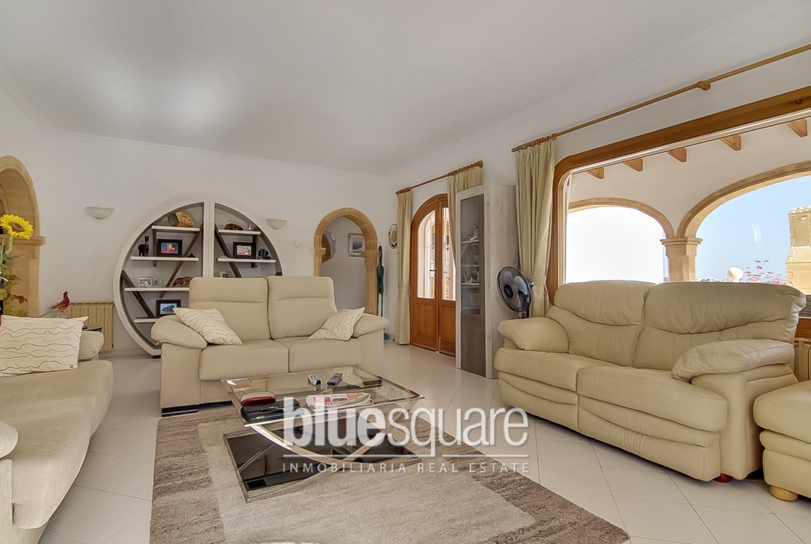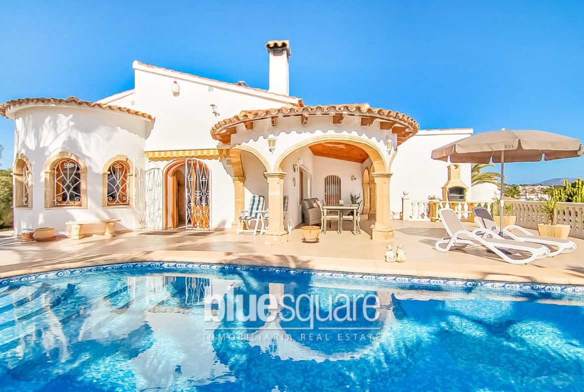 Exclusive to Blue Square. This quaint and immaculately presented villa is set in well kept gardens with mature palm trees and boasts one of the best views for its location. One level villa which consists of 2 master bedrooms with extremely large ensuite bathrooms, 1 double bedroom, a guest bathroom, separate independent kitchen, dining room and a super warm and spacious living room with panoramic windows that look out onto the large covered riu rau terrace. The grounds offer ample terraces all round the 10×4 south facing swimming pool. There is a BBQ area, 2 car garage, parking for at least 6 cars, large under build for storage plus an extra area which could be converted into a 1 bedroom apartment. The property also benefits from central heating throughout and air-conditioning.