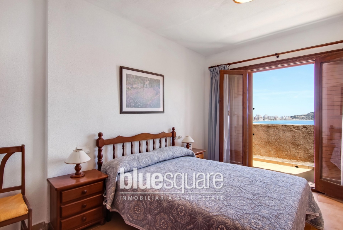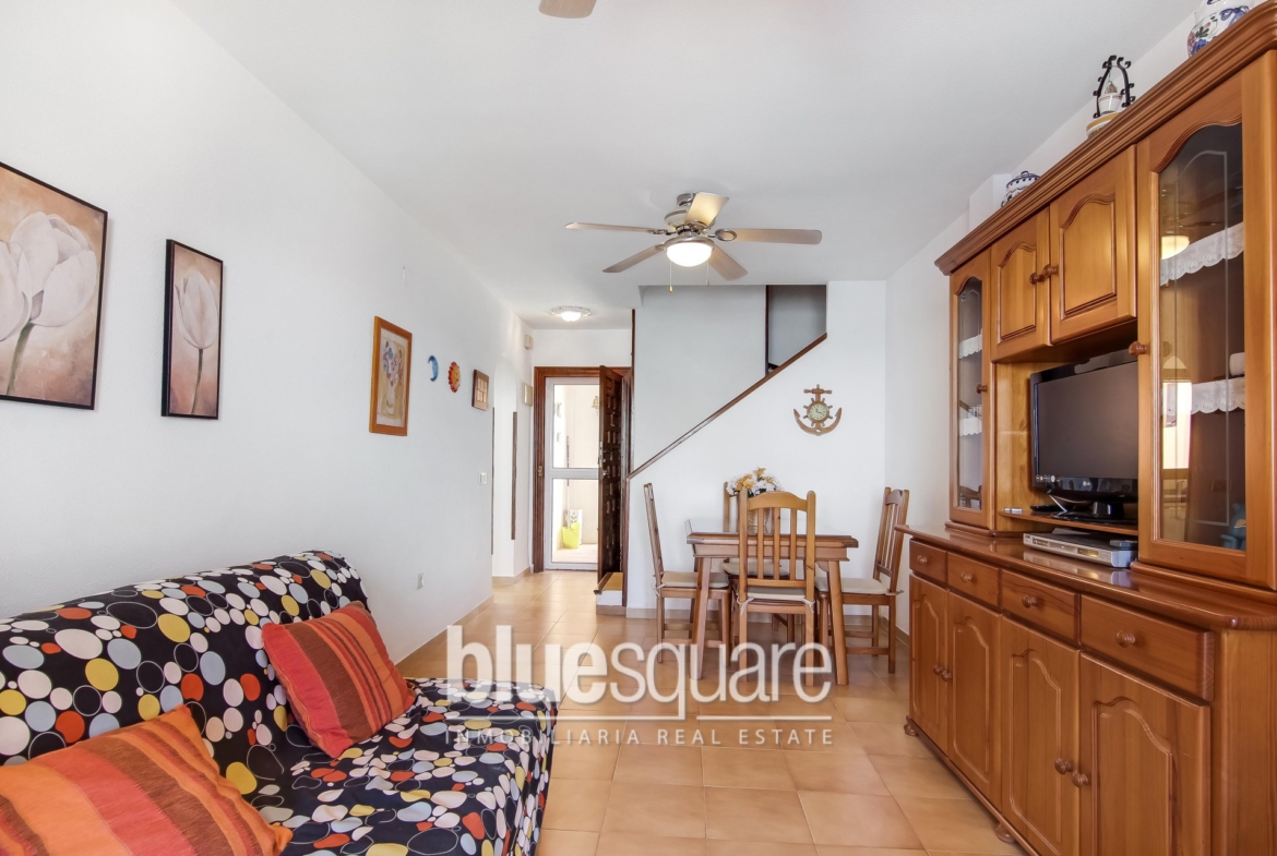 Beautiful triplex located in a quiet residential on the first line of the sea. The main level is accessible by stairs and consists of entrance hall, kitchen with reverse osmosis and living room with wonderful sea views. On the upper level there are two bedrooms, a bathroom and a balcony with views over the sea and the Rock. Community parking in the Residential. Communal swimming pool.