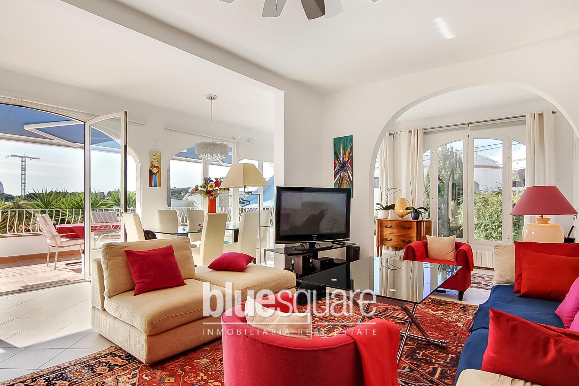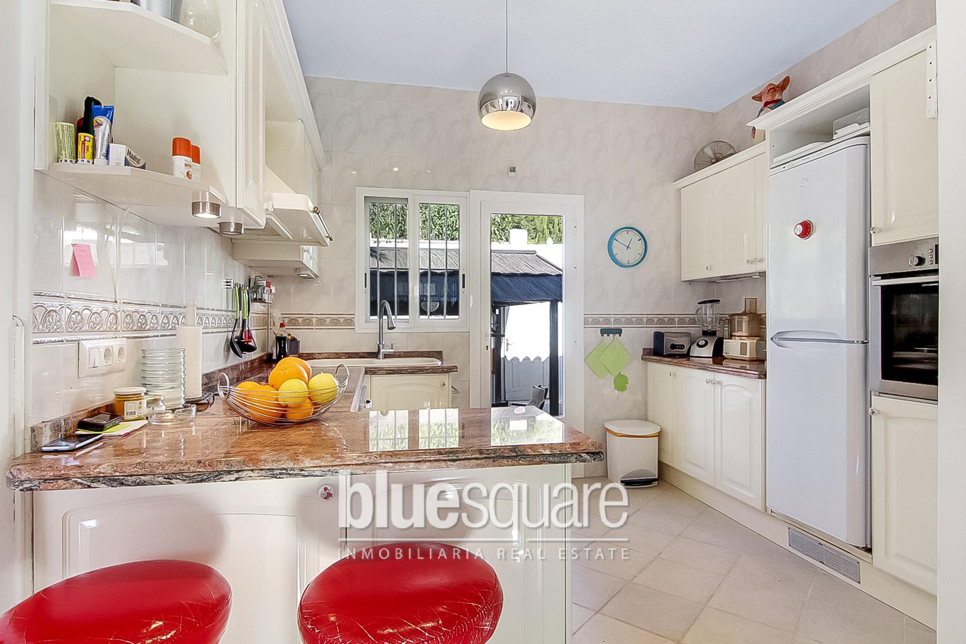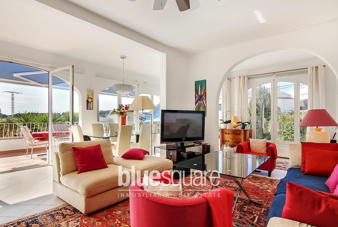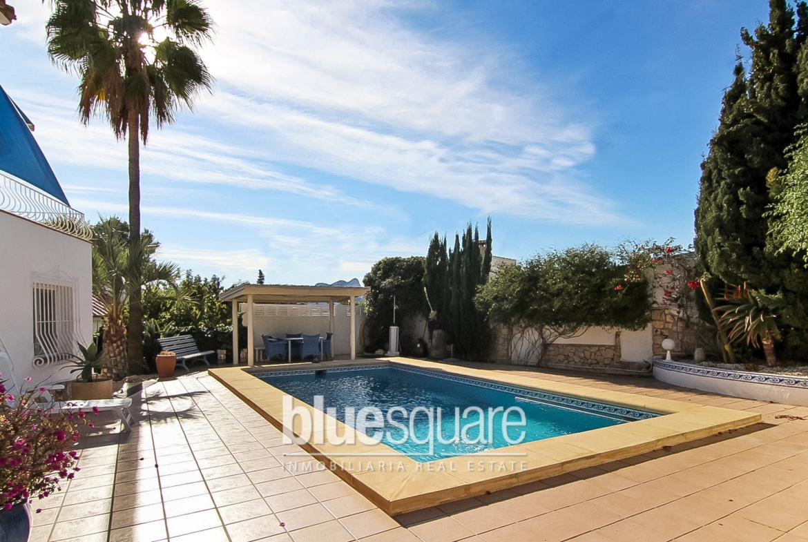 This recently renovated villa is situated about 400m to the beautiful La Fustera beach and its supermarkets and restaurants. It is located on a private plot with nice open views to the sea. The house consists of 2 levels: the upper level has 1 master bedroom with ensuite bathroom and a big walk-in wardrobe which can easily be converted into another bedroom. The very spacious living and dining area with big and fully equipped open kitchen has great windows and French doors that leads to the lovely terrace where you can enjoy the beautiful sea views. Through the inner staircase you arrive at the lower level with 2 bedrooms and 1 bathroom, a living/dining area with open kitchen. There is a separate storage room that can also easily be converted into an extra bedroom. The lovely private swimming pool is surrounded with large terraces, summer kitchen and garden with beautiful exotic trees. On top of the house there is a large solarium from where you can enjoy the sun and nice views. There is a carport with electric gate.