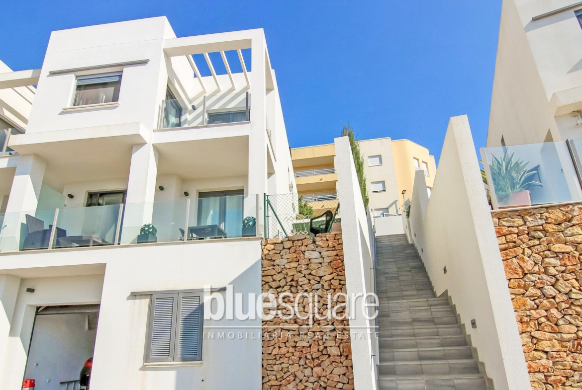 This semi-detached fully renovated townhouse on 3 levels is located in a peaceful, quiet and gated complex just outside of Benissa town. It’s south facing and benefits from beautiful sea, countryside and mountain views and is within walking distance to the town and all amenities. On the top floor there is an entrance hall with a large storage space, single guest bedroom with ensuite shower room, double bedroom and master bedroom with en-suite bathroom and walk-in wardrobes, both with access to a terrace. Downstairs leads to an open plan living and dining space with an open American style fully fitted kitchen. French doors lead out to a covered terrace with outdoor dining space. Adjacent to the kitchen is a utility room. The lowest level is where the garage/bar/gym resides accessed via secure electronic gates. The complex benefits from a lovely swimming pool.