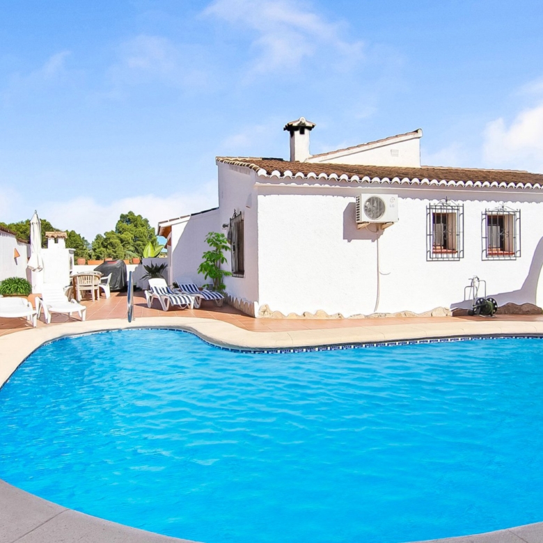 This villa is situated about 1km from the Fossa beach in a quiet and residential area. The house consists of 2 separate floors: the upper floor has 2 bedrooms and 2 bathrooms (1 en-suite), a big living and dining area with open kitchen, a glazed covered terrace and an exterior terrace with open views to the sea and the Penon de Ifach. On the ground floor, we have a guest apartment which consists of 2 large bedrooms, 2 bathrooms, spacious living dining room, kitchen and laundry room. It connects directly to a covered naya and the swimming pool with terraces, outside shower and bbq area. The garden is beautiful, with irrigation system and plenty of fruit trees. It also has a large garage and ample parking areas accessible through an electric gate.