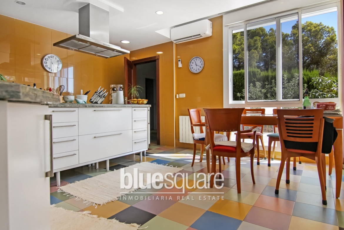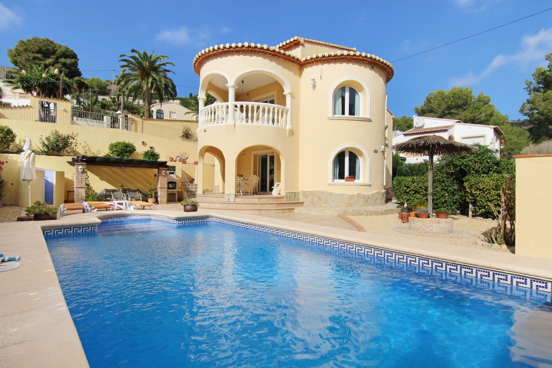 This unique home is distributed over 2 floors and on a large flat plot with lots of privacy. The villa consists of a large bright living/dining room with an office, a spacious kitchen,3 large bedrooms, lovely sun terrace and also a rooftop terrace where you can enjoy stunning views of the sea. The grounds of the villa are very low maintenance with fruit trees and a stunning pool area. There is also parking for several cars. Viewing is highly recommended.