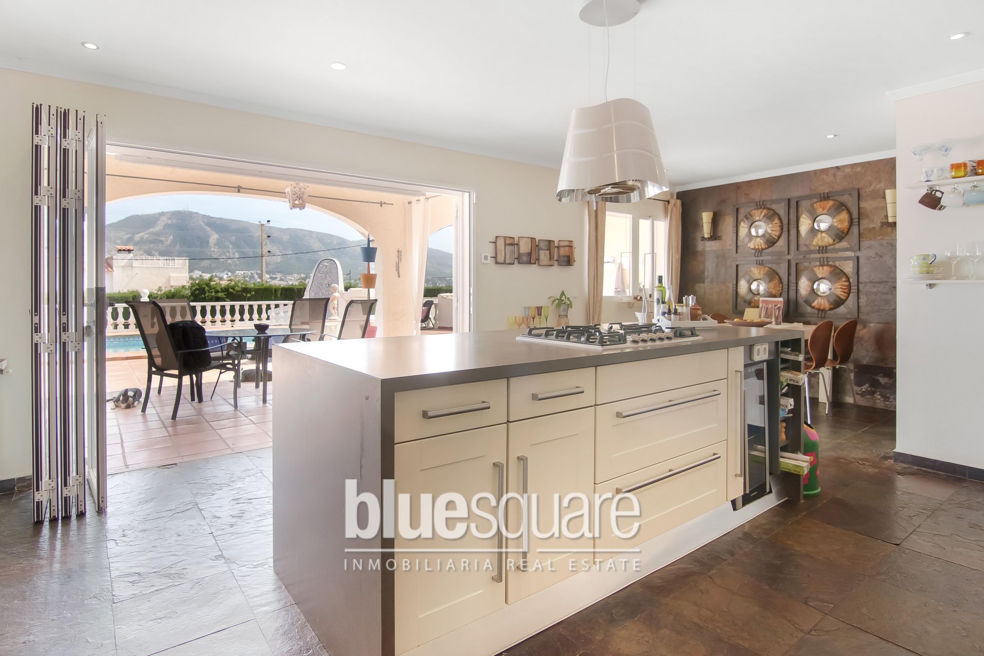 This large 5 bedroom, 4 bathroom villa is located between Alfaz del Pi and Albir in a quiet rural area, on a plot of 2100 m2. The location is slightly elevated giving fantastic sea and mountain views from property. The pool and main terrace is south facing. The property also has a large terrace from the master bedroom with panoramic sea views. There is a small private chalet on the plot, which is currently used for guests. There are large gardens, patios and an outdoor BBQ / dining area.