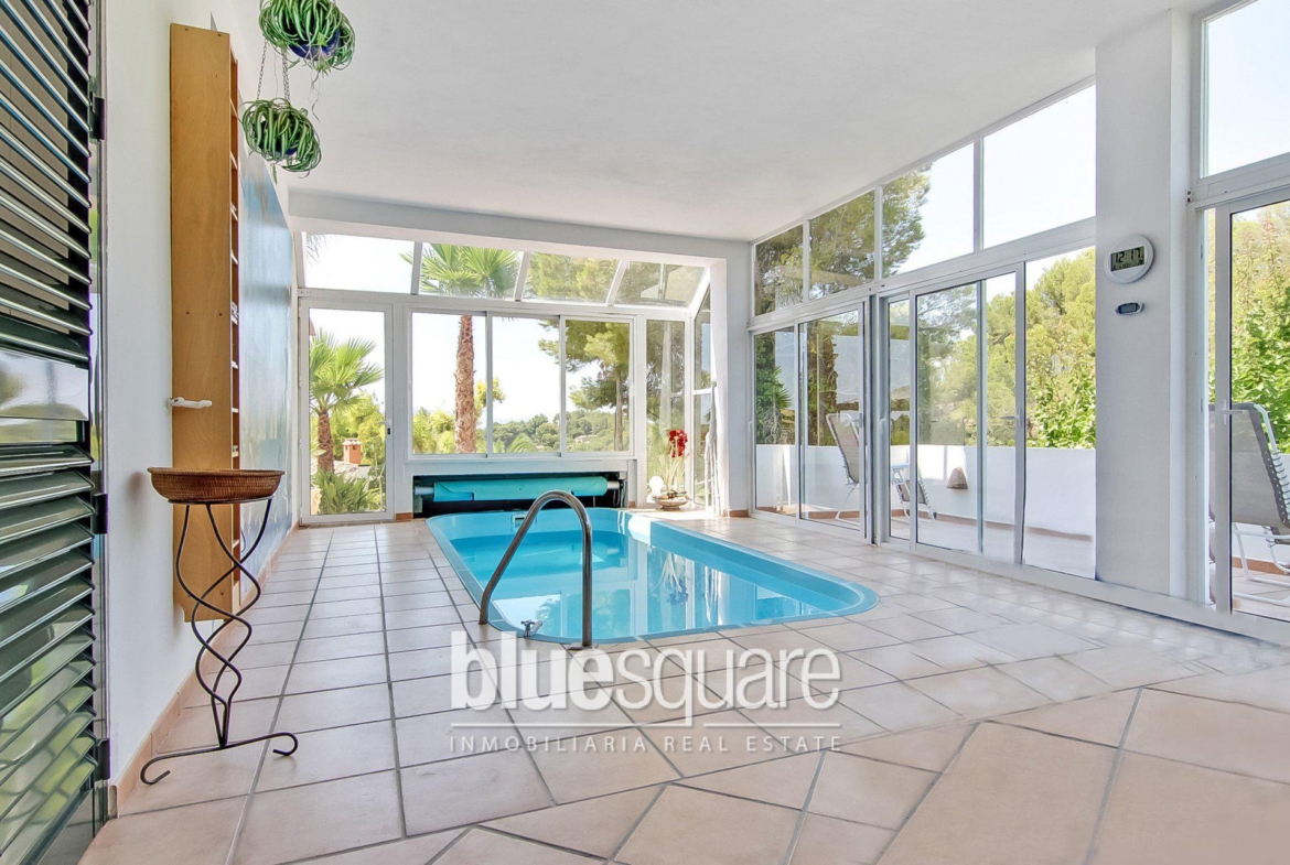 Beautiful villa in Altea la Vella, the ground floor consists of 2 bedrooms, an indoor swimming pool with sauna and a separate apartment with 2 bedrooms, living room, bathroom, kitchen, access to the swimming pool and private entrance. The first floor consists of an open plan kitchen, living/dining room and a master bedroom with an ensuite bathroom. The first floor can be accessed via lift. From every living space of this lovely villa you have access to separate terraces that benefit from beautiful views.