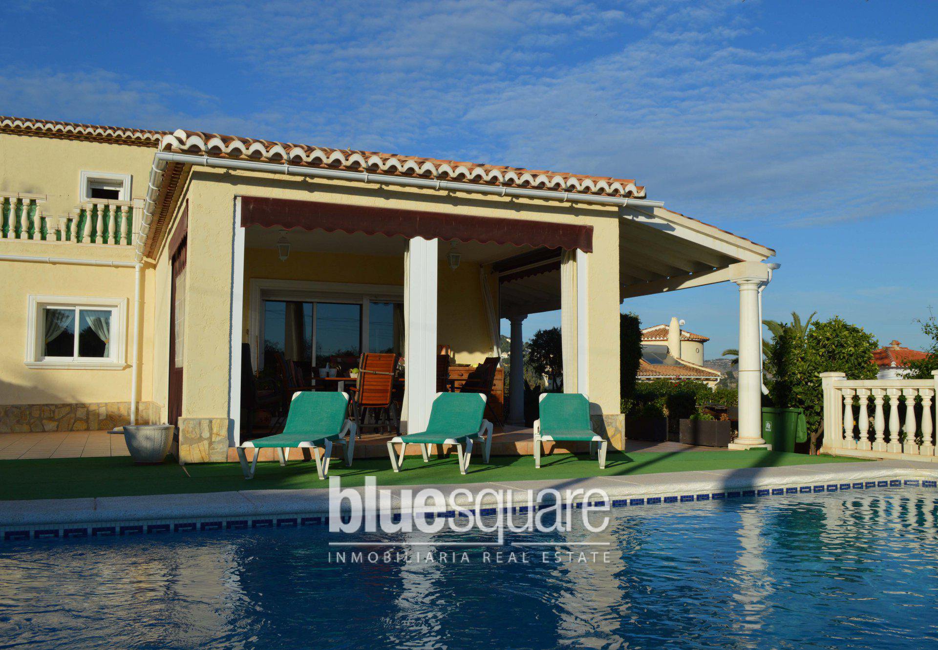 This lovely 6 bedroom villa is south facing and would make a great family home with great outdoor space, 8×4 swimming pool, and large porches and covered terraces ideal for all year living. The villa also has 3 bathrooms with one being en-suite with the master bedroom, it is completely furnished throughout with good quality furniture and design and air-condition in most rooms. Fully self-contained kitchen, living/dining room, hall, cellar, 2 door garage for 3 cars and parking for another 3/4 cars. Ample storage room, built in wardrobes, double glazed throughout, office, well water, wifi and pre-installation of air-condition in remaining rooms. Many extras.