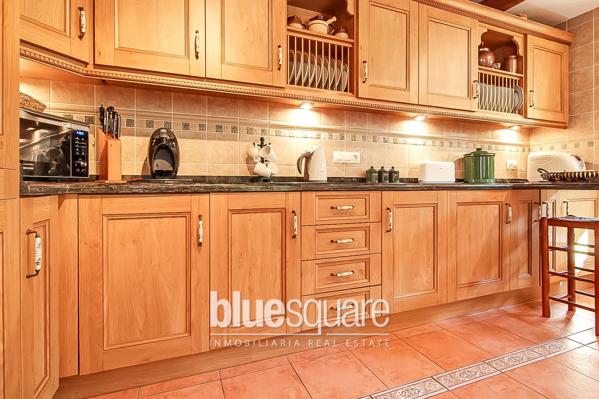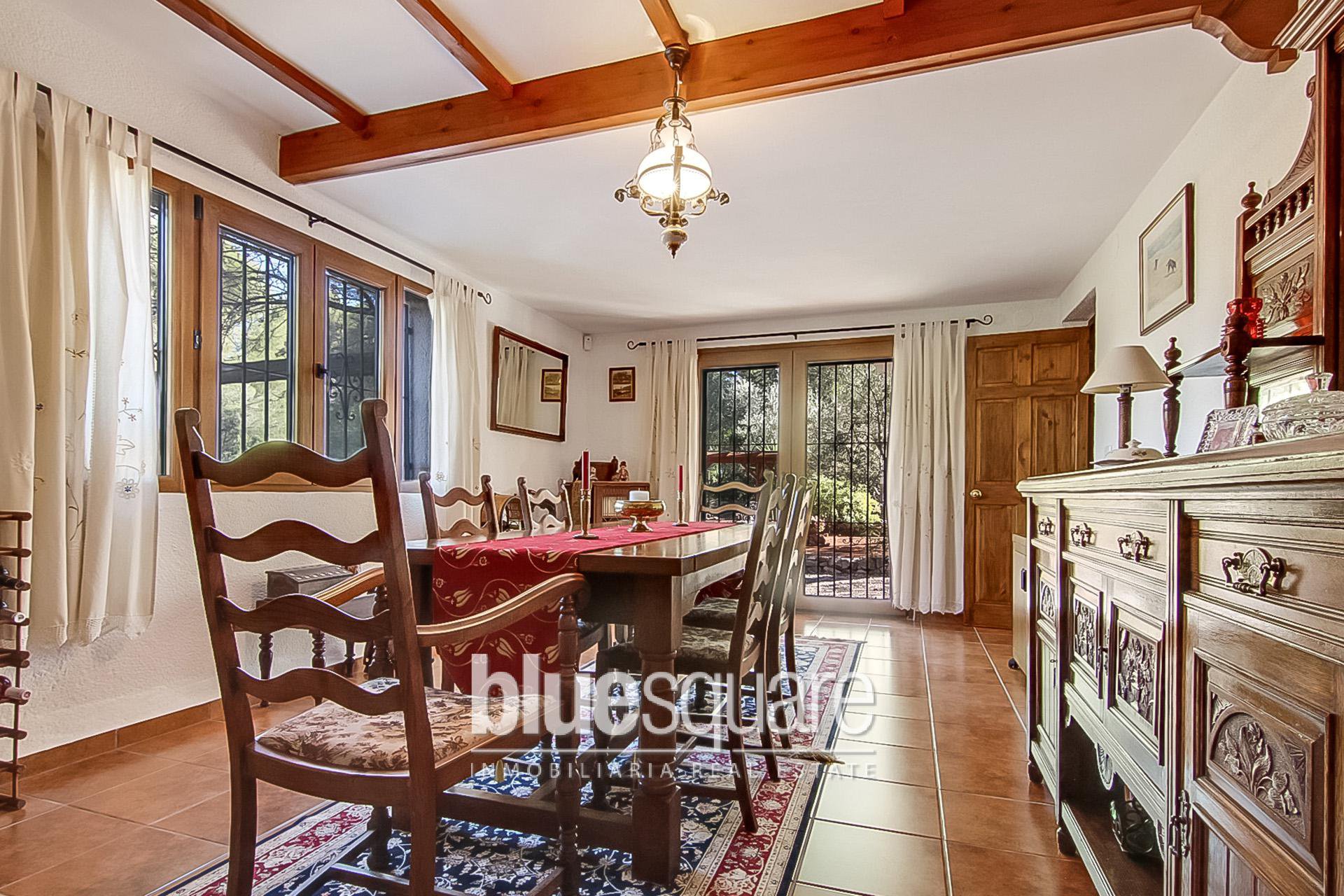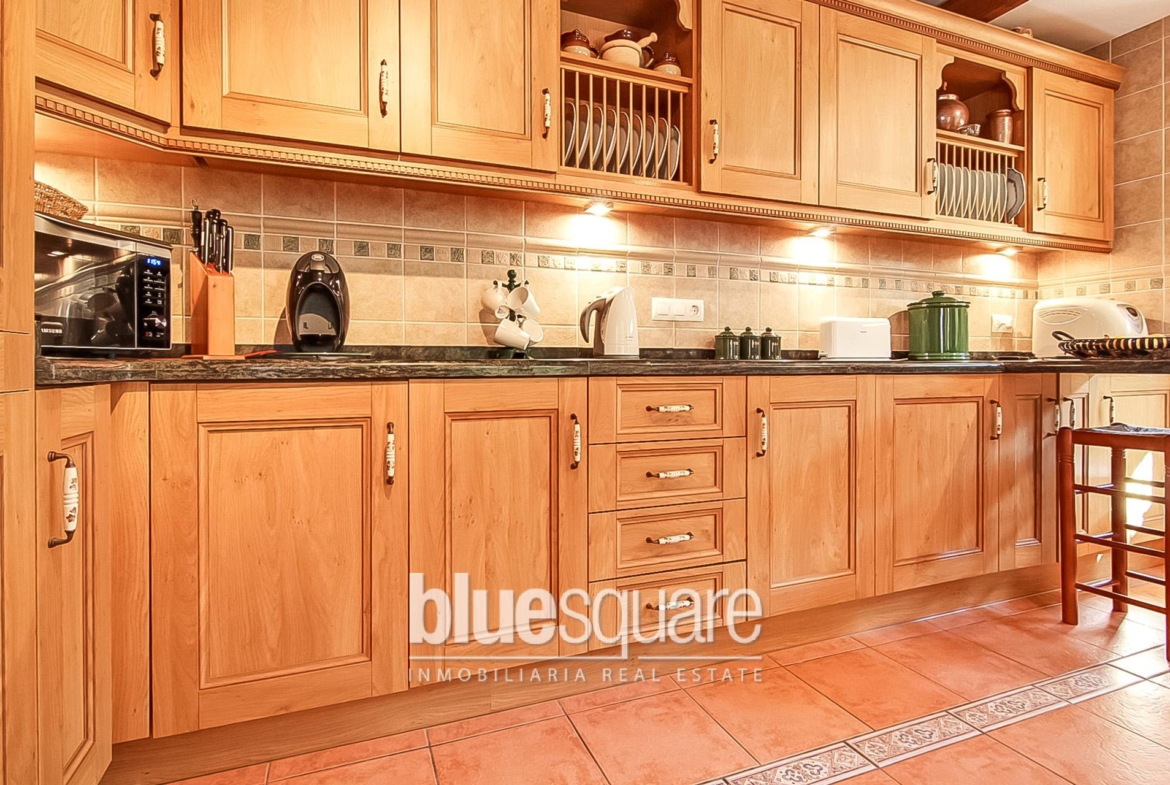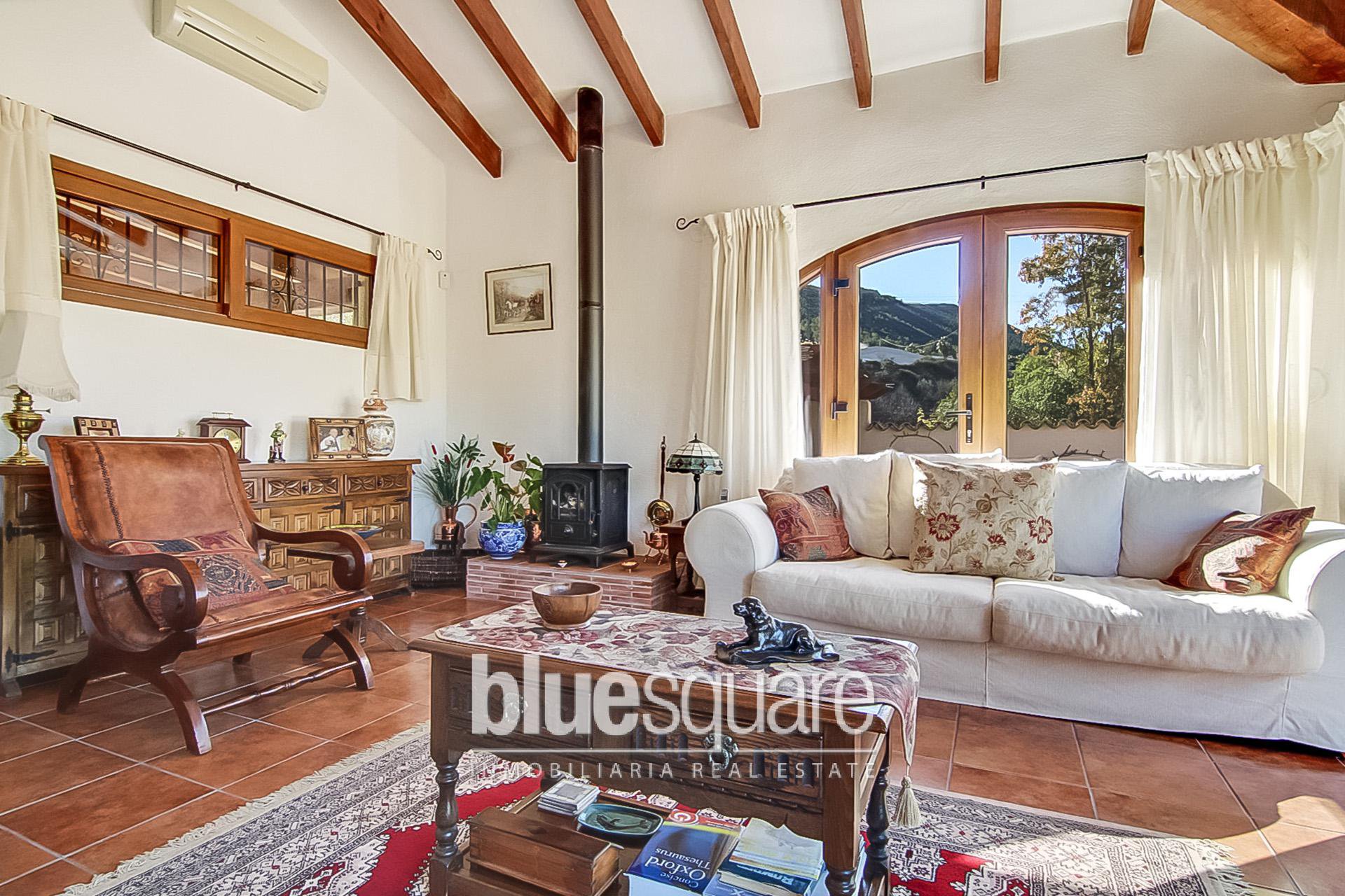 Built in the style of a traditional rustic farmhouse, the ground floor has a sitting room with beautiful views of the mountains and the valley from the duel aspect double glazed arched doors, which lead on to a south-west facing sun terrace, overlooking the gardens and pool. The large fully fitted kitchen has a good range of base and wall cupboards with granite worktops. There is a built in electric oven and a five burner gas hob, as well as a dishwasher, a washing machine and a fridge freezer. The spacious separate dining room has access to the rear garden via patio doors. There is also a cloakroom and a ground floor double bedroom, with an ensuite bathroom, including a corner bath and separate walk-in shower. On the top floor, there are a further 3 double bedrooms plus a study or fifth double bedroom, a family bathroom and a shower room. 3 of the bedrooms have large built in wardrobes. There are magnificent beamed ceilings in the sitting room and throughout the ground floor. Both of the sitting room and dining room are fitted with a wood burning stove. In addition there are heating and air conditioning units fitted in the main bedroom and sitting room. All the PVC wood grained double glazed windows are German manufactured and of excellent quality with 70 ml frames. They have a tilt and turn operating system and are fitted with mosquito nets. There is a 5 point locking system on the doors. There is an alarm system installed in the house, which has recently been upgraded with interior intruder cameras. There is also a range of light-sensitive wall lights all around the exterior of the property. The property is set back and well screened from the road, and stands on a plot of just under 5,000 m2 (approx 1 acre) and has a good cover of shrubs and trees, including pines, almonds and olives. There are several terraces surrounding the house, both sunny and shady, one of which has a built-in barbecue. There is also a charming, shady walled courtyard, which provides an additional eating area. There is an automatic irrigation system throughout the garden. The large swimming pool of 10x4m with surrounding terrace, has recently been re-furbished.
