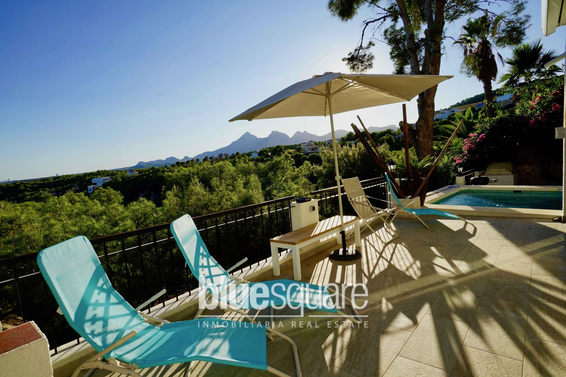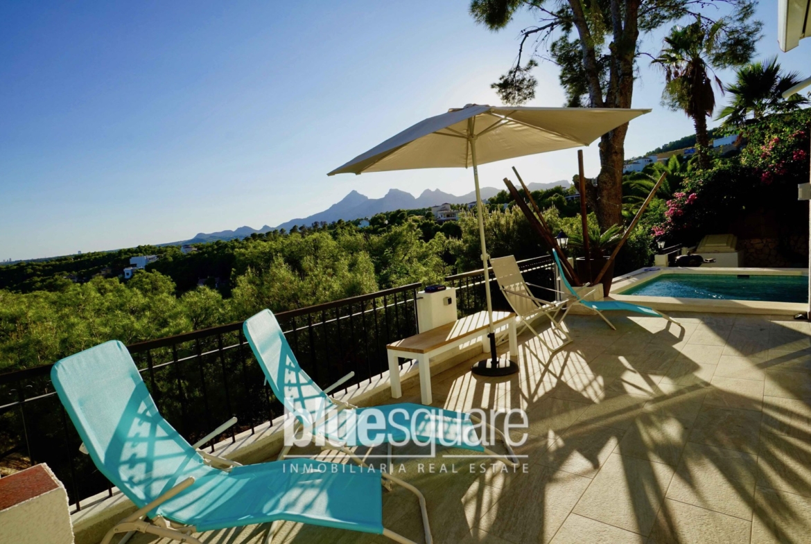A stunning South West facing Ibiza style Villa, in a prime location, with breathtaking views which extend to over 15km. Located amongst nature, every day at this property is different, with no noise from cars this property has amazing fresh air and sunsets. Whilst you are surrounded by the most beautiful nature, there are many fine restaurants, cafes, bars and a nearby bakery which are all located in the charming village of Altea la Vella. The property has had a complete reform to an exceptionally high standard in 2016/2017 and has benefited from keeping the charming Ibiza style and aesthetics. This property is in a very private location, but is only a few minutes drive from the popular old town of Altea, only 3km to the beach and 3km to the main AP7 motorway. The property has four bedrooms which all benefit from fitted wardrobes. There are four bathrooms, and a large lounge area which opens out onto the amazing terrace and all its views. There is an amazing self contained apartment on the upper floor, which could be used by family members. There is an outdoor heated spa pool which benefits from the far reaching panoramic views. There is a large terrace adjacent to the pool and an elevated outdoor dining / lounge area. There is also an additional terrace located on a lower level for outdoor dining. Viewing of this property is highly recommended to appreciate the quality, location and style. One not to be missed.