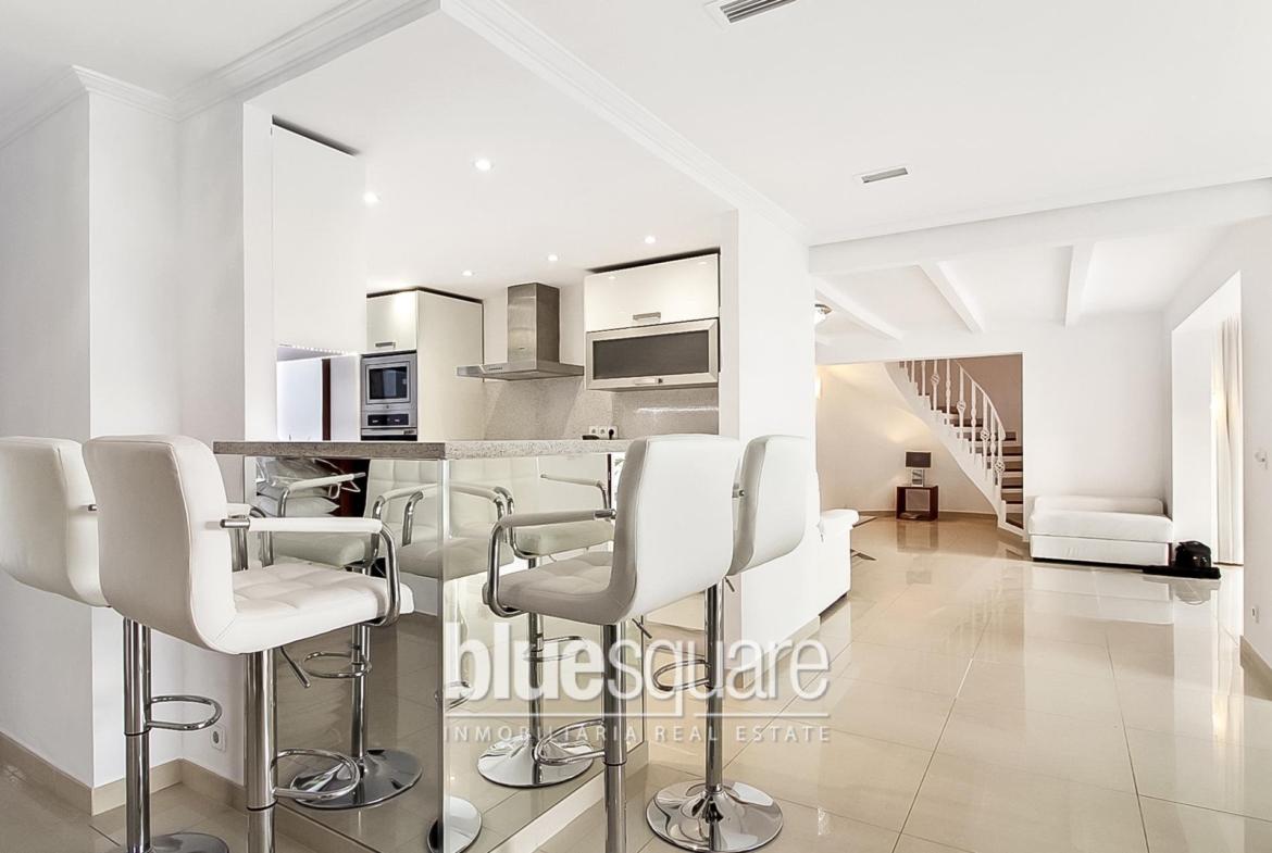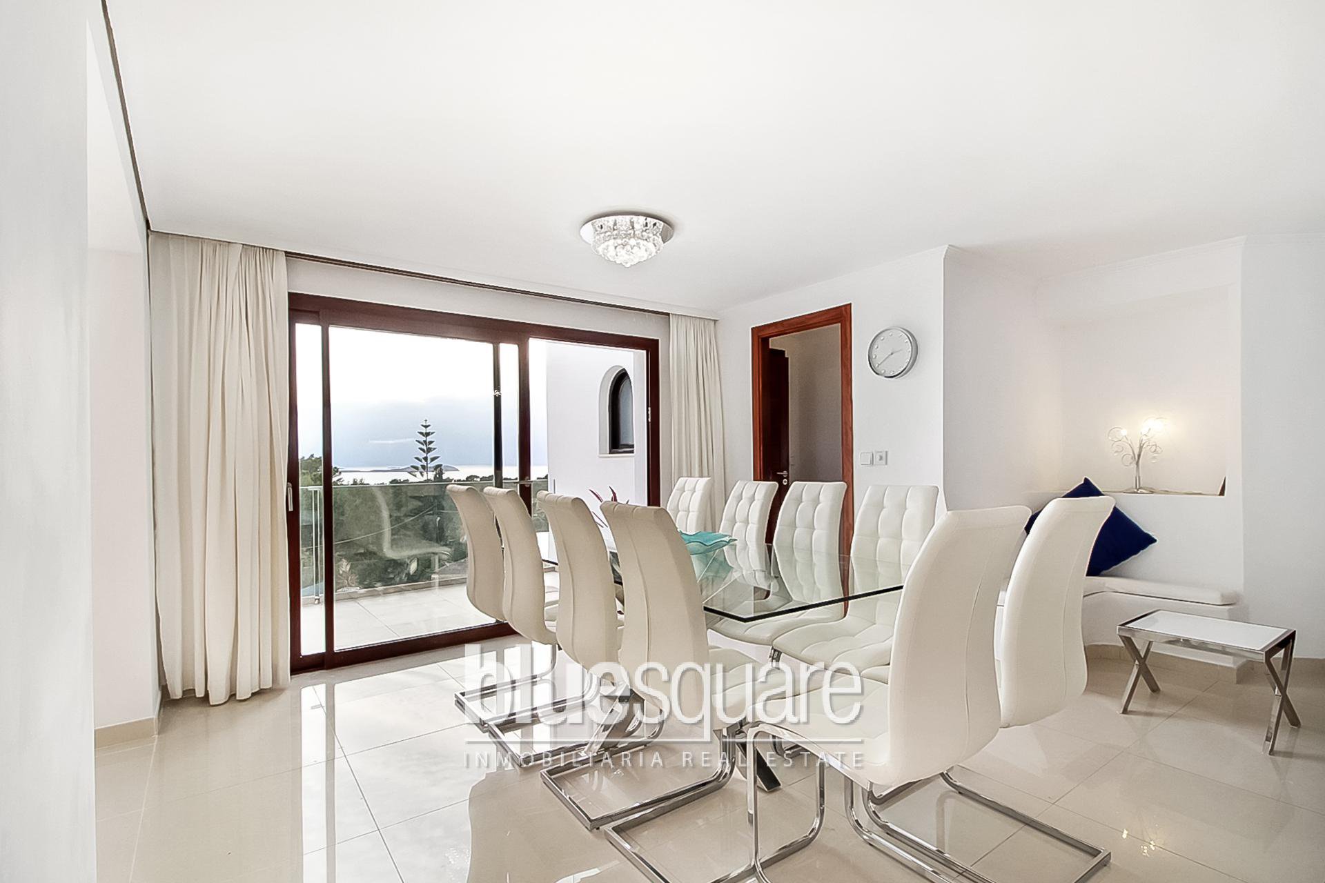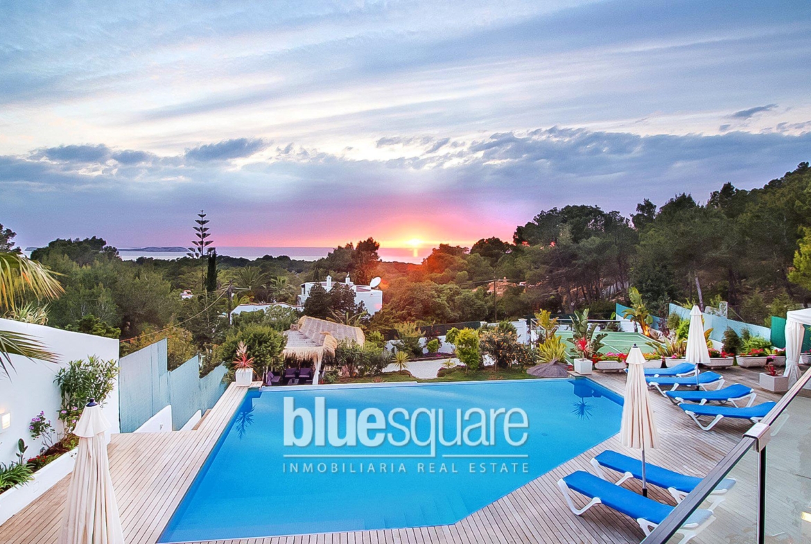 Large property with views to the sunset and the island of Conejera. The villa consists of 5 bedrooms each with en-suite bathroom, a kitchen, a spacious living/dining room and an independent apartment in the lower part of the villa. The gardens are distributed over different levels. The property also features a Jacuzzi and two swimming pools with waterfall effect from one pool to another, a tennis court and a gym. A few minutes from the beach of Cala Salad and only 20 minutes by car from the city of Ibiza.