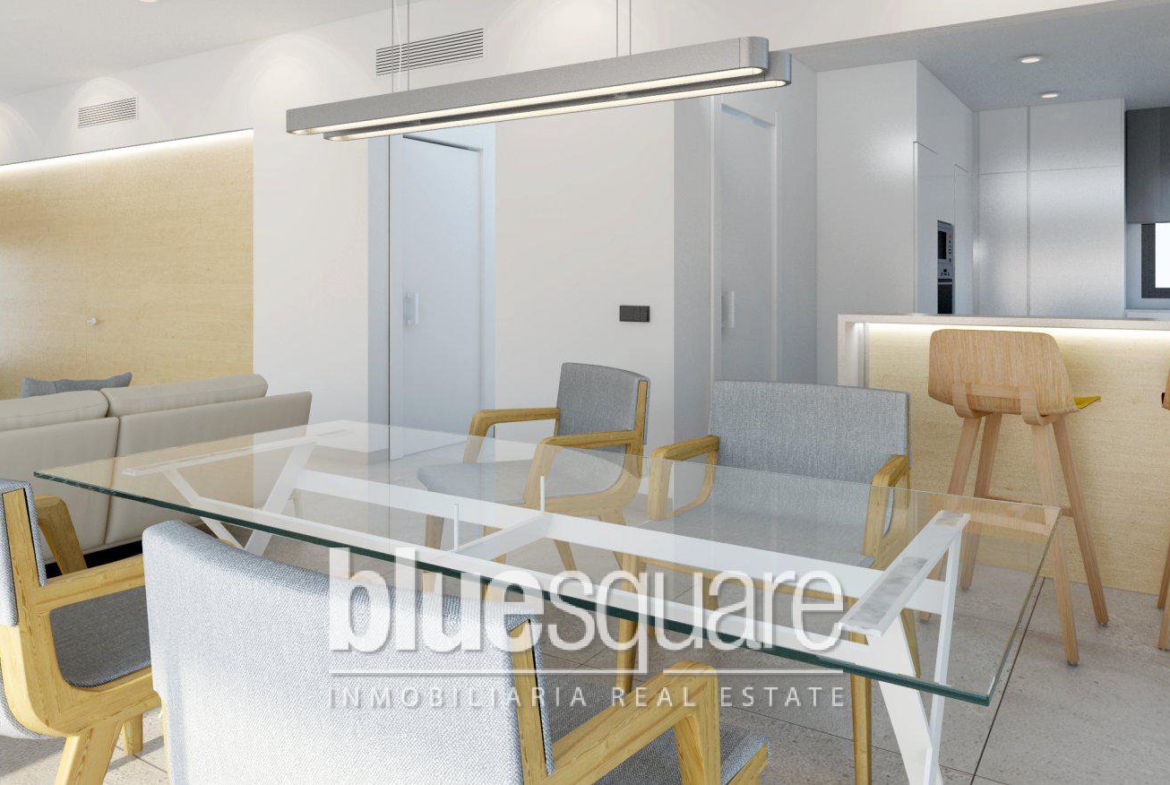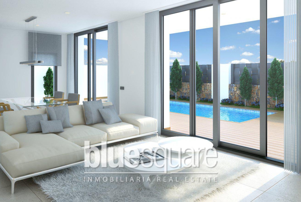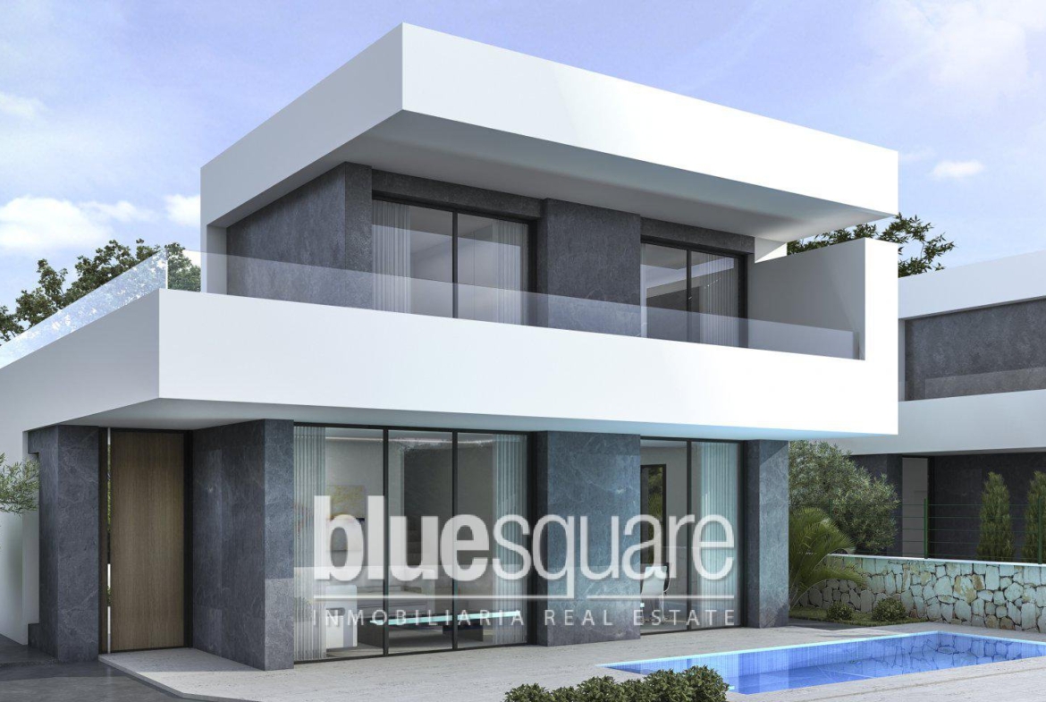 New build project of 20 independent villas in Denia with sunshine throughout the whole year, this new project of combines high end finishes, comfort and design in a convenient location, 1 km from the beaches and 1.5 km from the city centre. The properties built on two floors are finished with private pool, garden and covered parking place and feature a modern open plan design, that always connects with its environment. The pool is provided with staircase, shower and large terrace. The completely fenced and gated plot is landscaped with lawn, trees and lateral stone walls, metal fences and hedges. Building work of this specific OYKOS DESIGN type on plot No 19 Building specification Installation of centralized air conditioning by ducts, hot/cold airzone system in every room, made by Daikin. Exterior carpentry of aluminium „Strugal“, doble glazing with 6+6 security pane and thermal insolation by gas (Guardian Sun). Interior carpentry: armoured wooden entrance door, interior doors with smooth finish (choice of 2 colours). Fitted wardrobes. Open kitchen with islet, completely equipped with lower and upper furniture, silestone worktop and integrated electrical appliances of BOSCH. Bathrooms: Suspended toilets of Roca. Large shower plate of white slate, furniture of „Coycama“ and shower screen. LED line lighting at facade, fitted wardrobes, staircase, kitchen and house entrance. Integrated sound system throughout. Preinstallation for fibre optic, SAT, TDT and radio. Installation of solar heated system composed of 2 solar panels fitted on the roof, mixed hot water heater (solar/electric) of 250 l. Copper pipes and control panel in kitchen. Video entryphone, automatic sliding gate. Automatic irrigation system. Maintenance of garden and pool free during the first year.