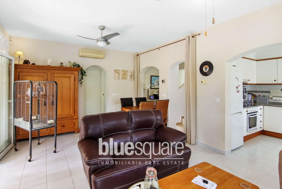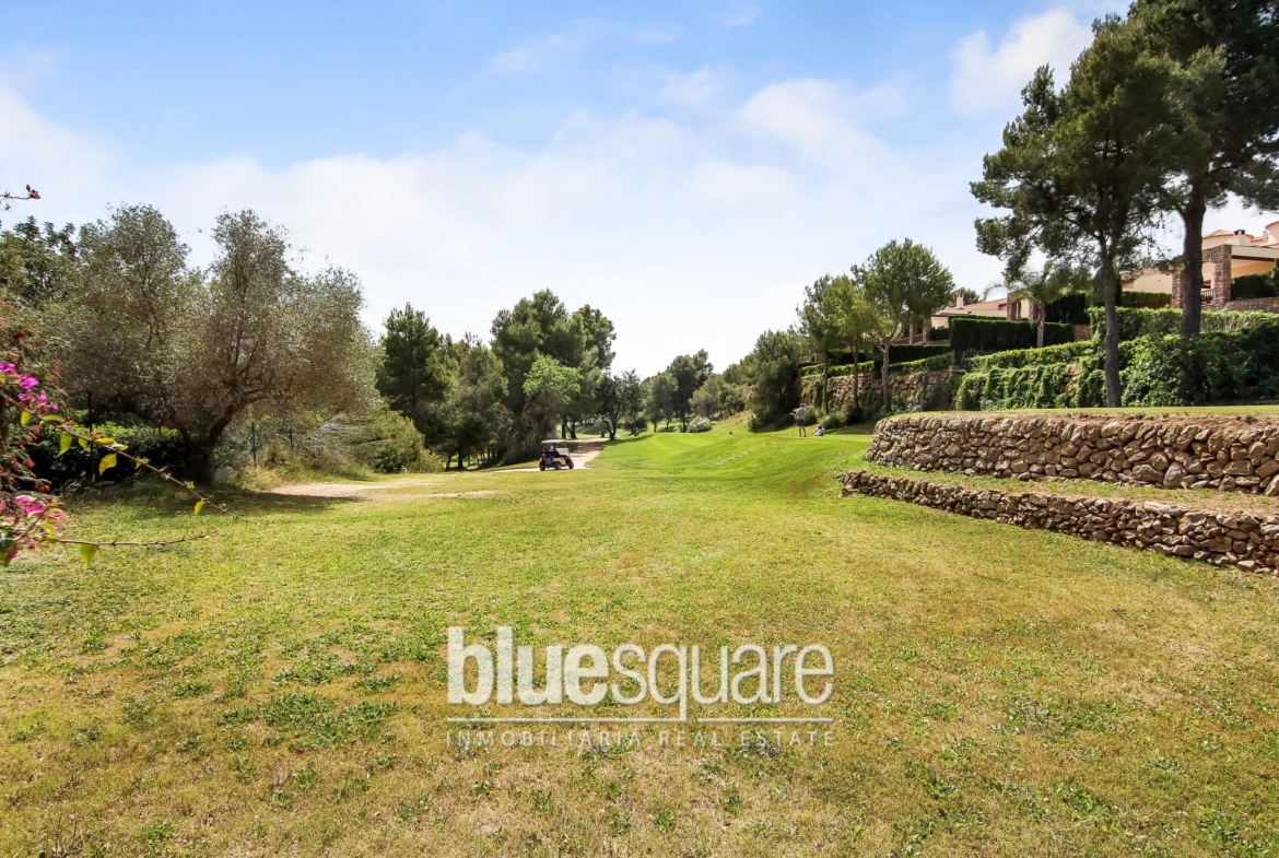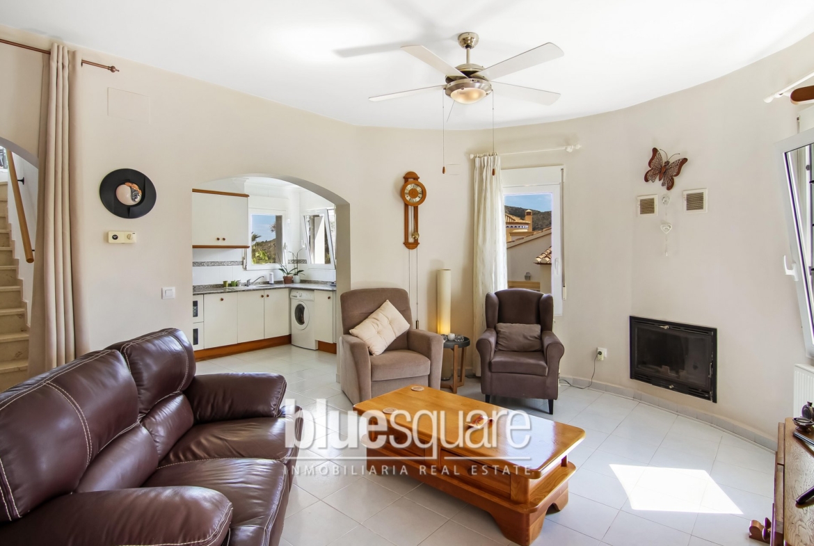 Charming 3-Bedroom detached villa with large communal swimming pool directly in front of the golf course with commanding views. The villa disposes of an open Naya with patio doors leading into the spacious lounge/dining room with log burner, the fully fitted kitchen, the library/occasional room, 2 double bedrooms and family bathroom. Upstairs is the large master bedroom with en-suite bathroom with walk in shower, and french doors leading out to the balcony with stunning views of the golf course. Outside is a gated drive and a low maintenance tropical garden. The villa benefits from all mains services, oil fired central heating and double glazing. The property is in the « Eagle » area of La Sella, which is very popular.