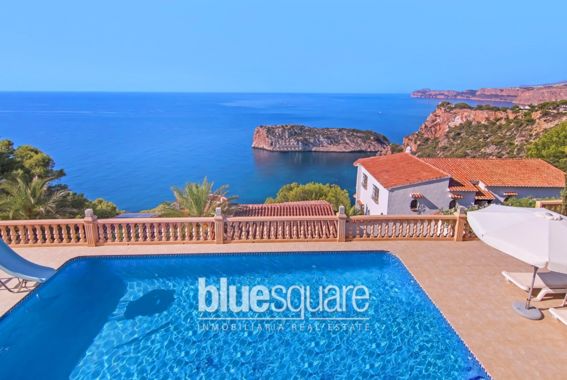 Looking over Ambolo bay and beach in Javea, is this elegant, luxurious and impeccable villa with breath-taking, panoramic, frontline, South facing sea views. Sitting 150 metres above the “Isla Del Descrubidor”, on a clear day one can see Ibiza towards the East, Ambolo beach below and all the way down the coastline towards Moraira with near perfect views of the sunrise over the Mediterranean. The refurbishment of ¨Villa Descubridor¨ was finalised in September of 2010 to the very highest standards with an elegant and minimalistic combination of traditional and modern design. Divided over two levels, both feature living/dining area and open plan kitchens. The master bedroom is on the bottom floor with dressing room and en-suite bathroom, and upstairs there are 3 more bedrooms, which is ideal for guests. Externally, through the main gate, there is large parking area for several cars. There is also a large garage for one car. Going down the external steps where a lovely waterfall trickles down, you get to the 10×5 pool area. The bottom terrace features a fabulous al fresco dining area with impeccable views.