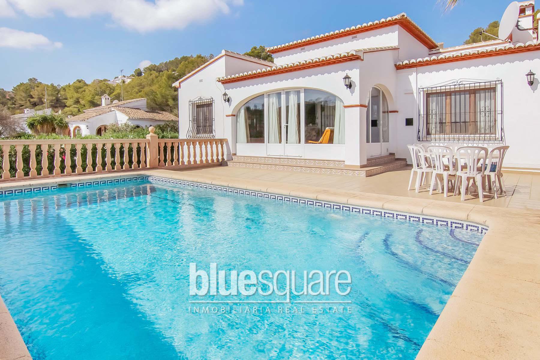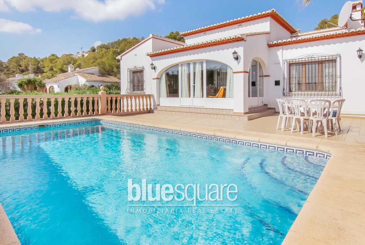 Exclusive to Blue Square 4 Bedroom 3 Bathroom villa for sale located in a quite area close to the beaches of Javea. Built on one level inside the villa you will find 4 Bedrooms 2 of them with ensuite Bathrooms , A further family Bathroom, Large lounge area with open fireplace, Kitchen, separate dining room and a enclosed Naya overlooking the 8X4 Swimming pool. The villa has double glazed units , air conditioning and gas central heating. Outside the villa there is a low maintenance garden , entrance gate, 8×4 swimming pool with open countryside and sea views and private parking space for 2 cars. A very good villa for under 350k in Javea. Viewing recommended!