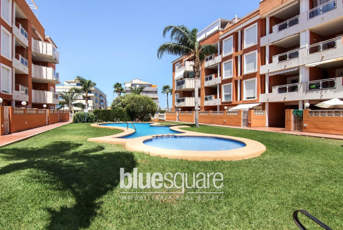 This first floor apartment is situated within a community on the edge of Denia town ideal for holidays or for all year living. Accommodation comprises of 2 bedrooms with built in wardrobes, 2 bathrooms one being en suite, a good sized kitchen, living dining room with doors to a covered terrace. The covered terrace has open views over the countryside. The apartment benefits from an underground parking space with storage room. Outside there are communal gardens with a free form swimming pool with separate children area.