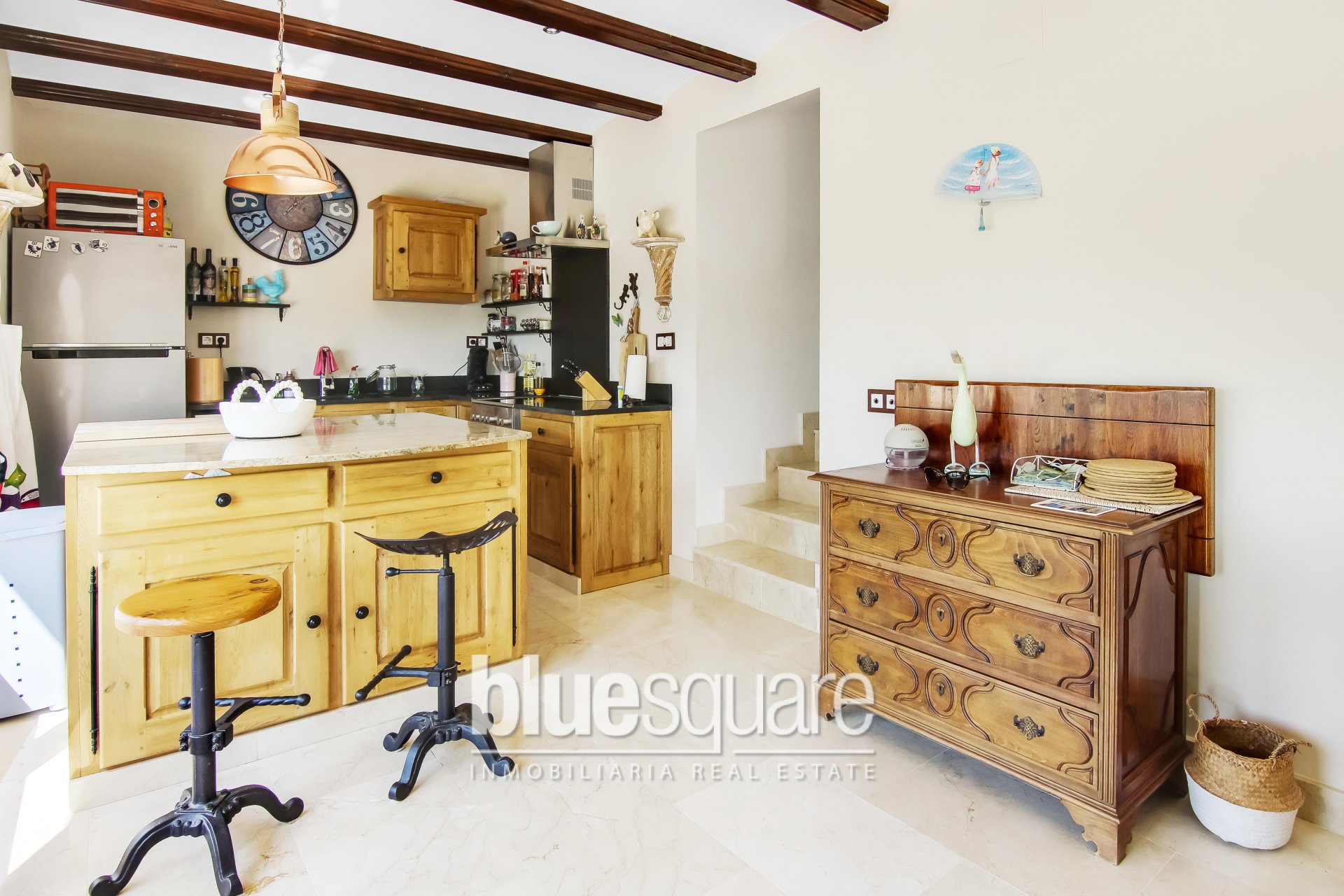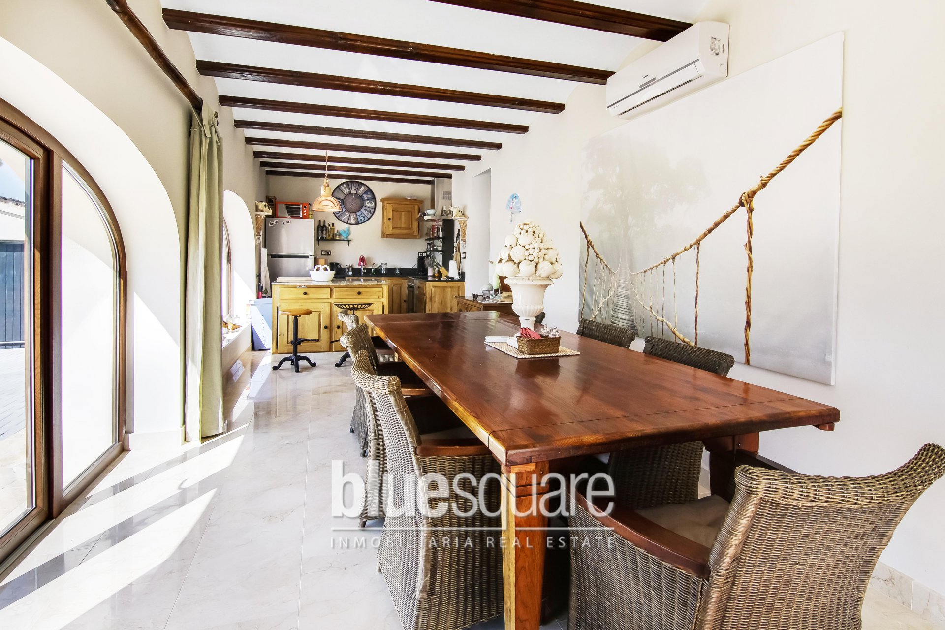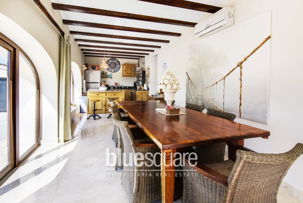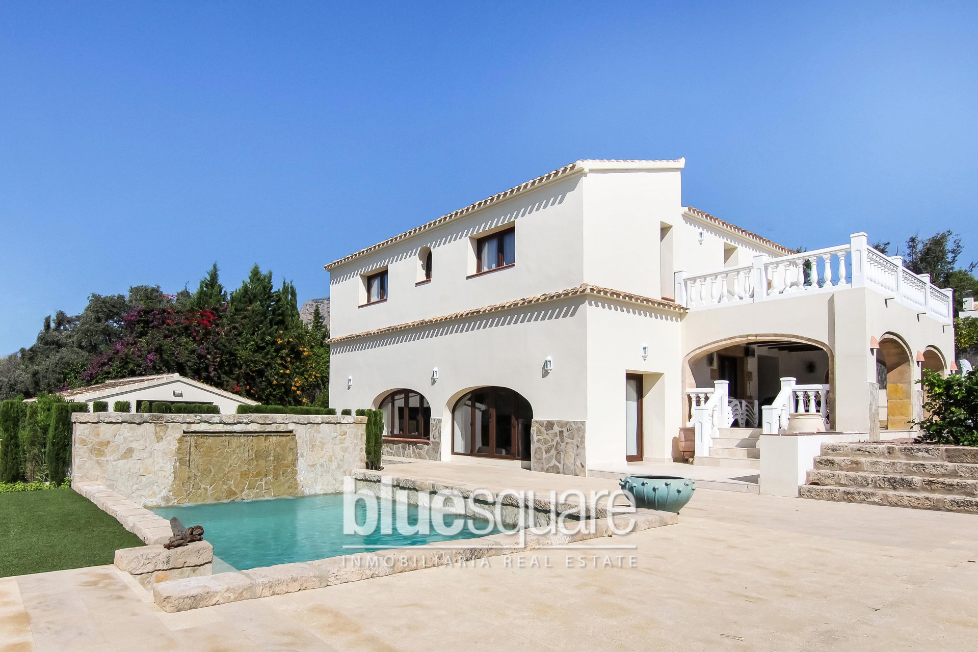 Exclusive to Blue Square. Stunning 5 bedroom, 3 Bathroom reformed villa located in Javea. Built on 2 levels, this stunning property has been reformed over the last couple of years to the highest standard and offers panoramic views of the open countryside. On the ground floor you will find a new kitchen/dinning room with doors leading out to the garden and swimming pool area. There is also a lovely living room with doors that open out onto a large covered naya then leading round to another seating/BBQ area, Also on the same level there is a downstairs cloakroom, a guest room which can also be used as an office. Upstairs you will find a master bedroom with ensuite and a large balcony where you can sit and enjoy the lovely open views of the countryside. There are also a further 3 double bedrooms and a family bathroom all again beautifully decorated. The outside of the property benefits from a low maintenance garden a fantastic swimming pool with a waterfall and large courtyard with an enclosed utility room which has an indoor BBQ facility. The property has air conditioning, double glazing, wood grain effect windows throughout and much much more. Viewings are highly recommended on this truly amazing property.