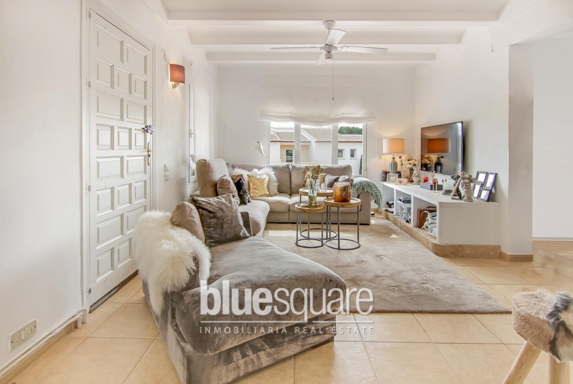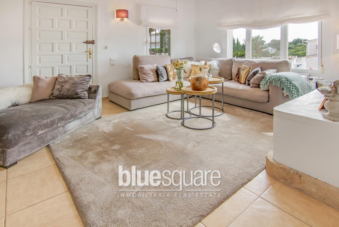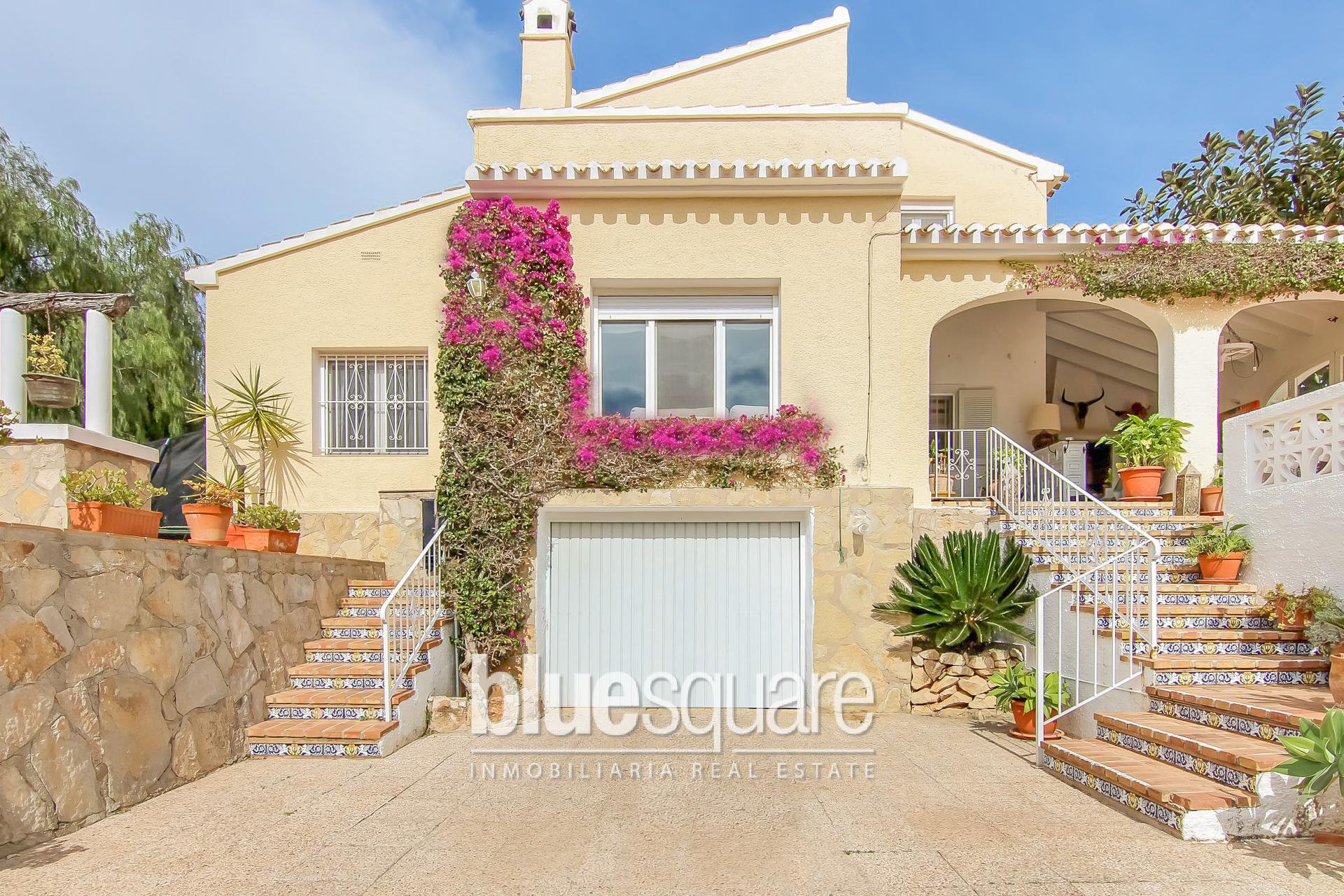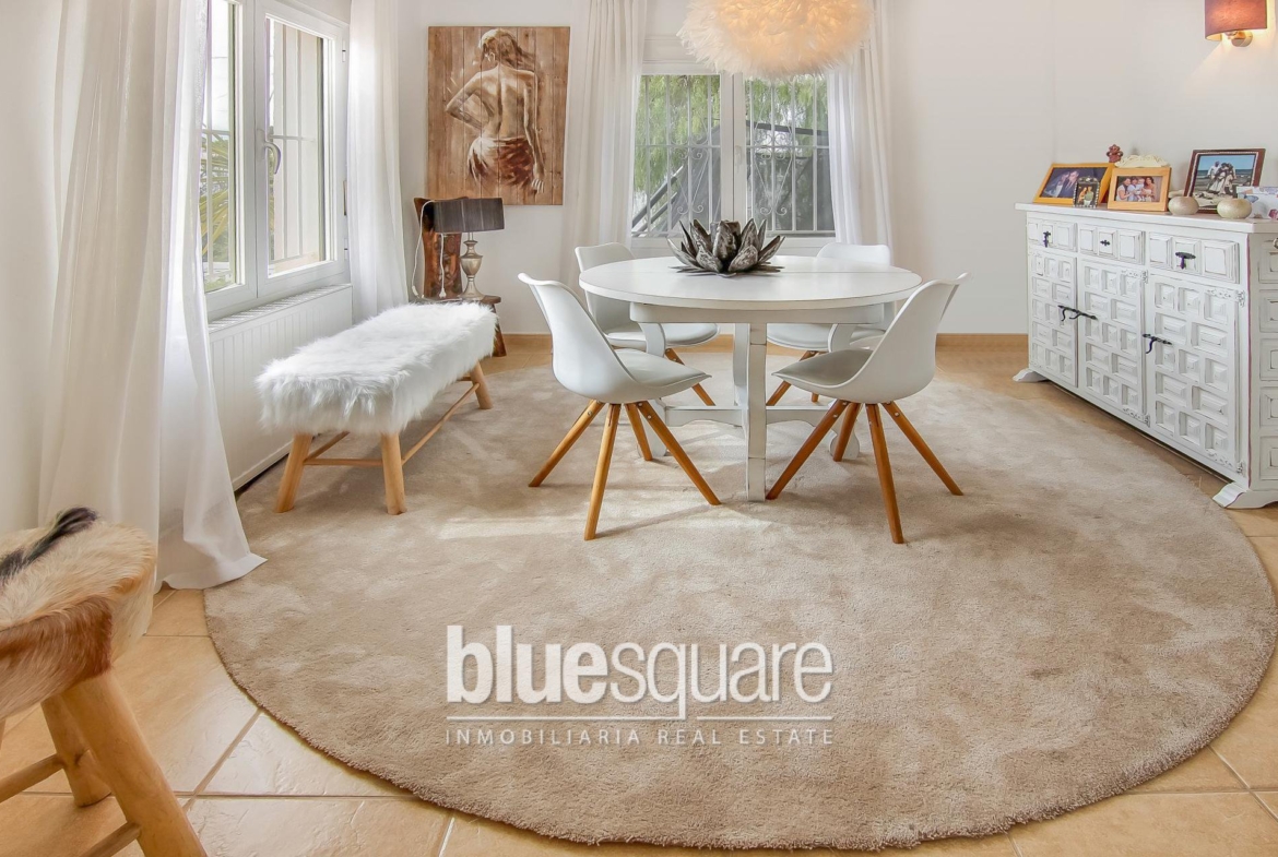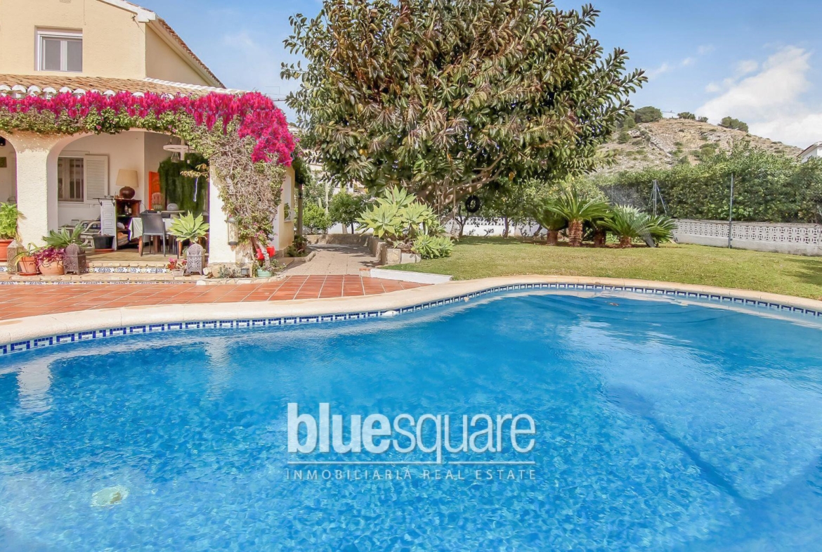Lovely south facing villa with lots of character within walking distance to Javea old town. The villa is distributed over 2 levels, on the ground floor there are 2 bedrooms, a large bathroom, a living room and spacious kitchen that connect to a laundry room and a back patio. Upstairs there is a spacious bedroom, a small study room that is currently used as a dressing room and a spacious bathroom. Outside the property there is a large covered terrace, a kidney shaped pool, fruit trees and a garage. The property has central heating and a fireplace and is located in a quiet cul de sac.