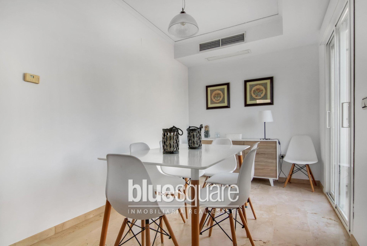 Semi-detached house 200 meters from the beach of Costabella in Marbella The house is built on 4 levels: – On the ground floor is a dining room, a living room with a fireplace that opens onto a southeast facing terrace. An independent kitchen overlooks a large terrace and a garden in the back. There is a guest toilet room from the entrance. – On the first level, there are two bedrooms and a bathroom and a master bedroom with en suite bathroom. – On the second level, there is a large solarium with beautiful sea views. – In the basement we find two parking spaces and a large space for storage. The house is in a gated community with a large pool and a pretty garden. It is located 2 minutes walk from one of the most beautiful beaches of the Costa del Sol, close to shops, restaurants and only 8 minutes from the centre of Marbella.