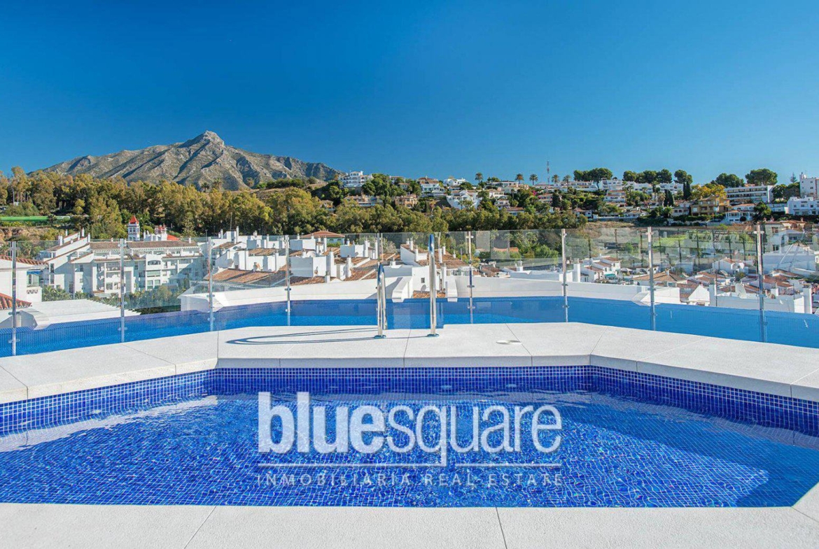 In Marbella, Nueva Andalucia, only 5 minutes from Puerto Banus. 2 bedroom apartment, 2 bathrooms, large living room with large windows with double-glazing Climalit that offer plenty of light and private terrace. Views towards Marbella. Spacious kitchen. The bedrooms have fitted wardrobes. Air conditioning and laminate flooring. It also has a parking space included in the price. The building has exceptional qualities with good finishes, gardens and infinity pool on the roof. Close to all kinds of services, playground, schools, nursery, institute, medical center, sports center, banks, supermarkets, pharmacies, restaurants, cafes, gyms, public transport. Marbella Costa del Sol