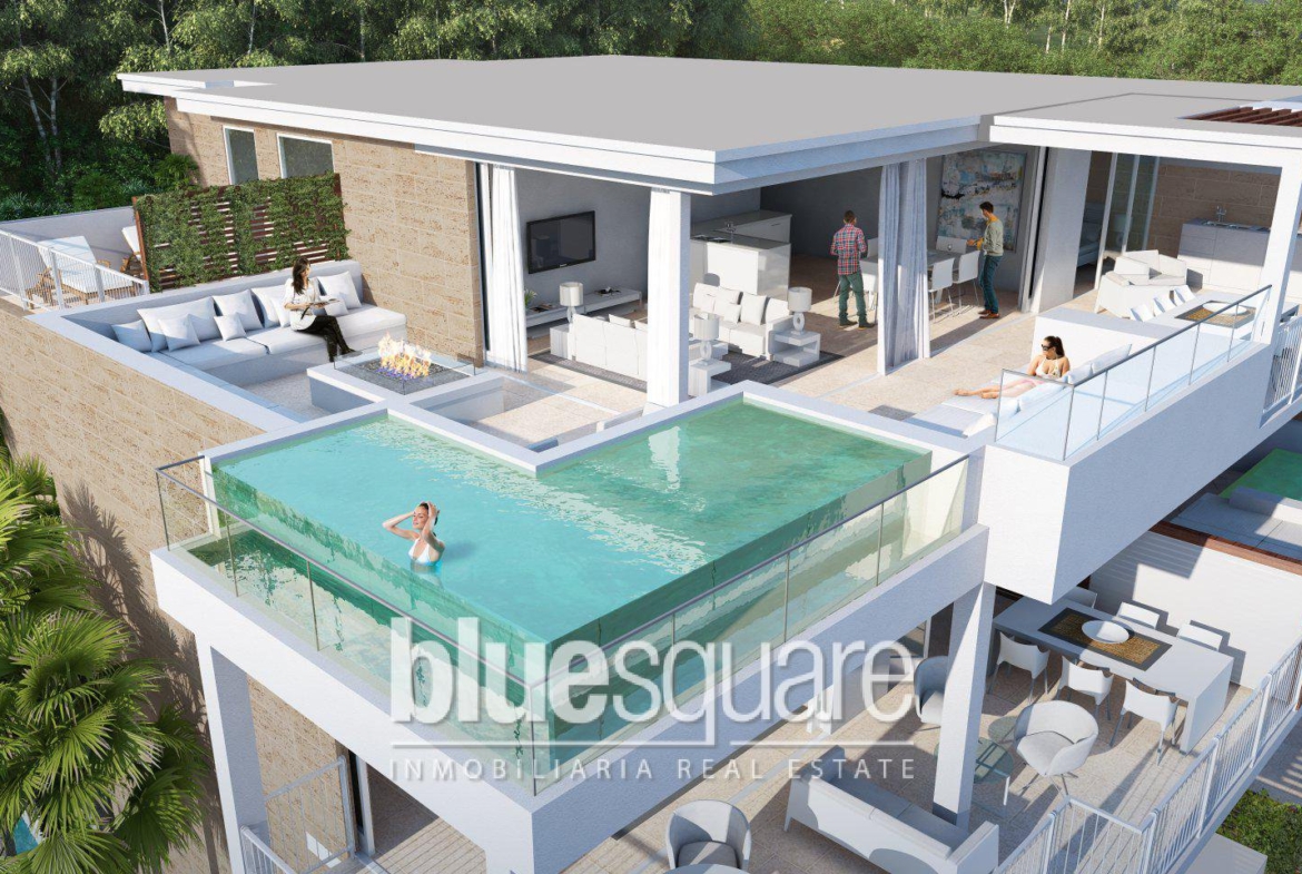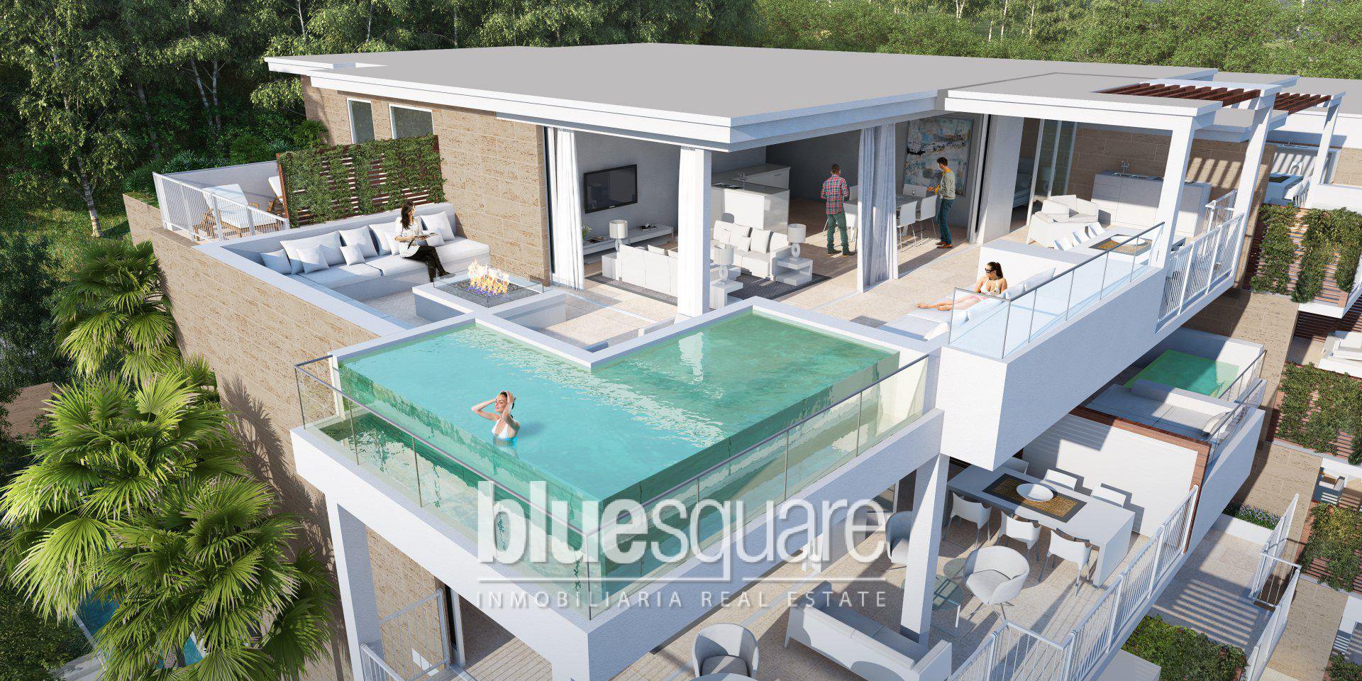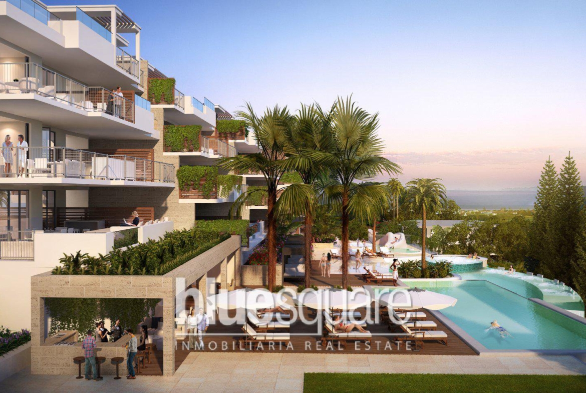 Modern design apartments of 2, 3 and 4 bedrooms in La Cala de Mijas, a few steps from the beach, the famous promenade, daily services such as restaurants, bars, shops and banks, as well as bus and taxi services, are located in the center of the city of Cala de Mijas. The development enjoys a privileged position on the Costa del Sol, with Malaga airport and the city of Marbella less than 20 minutes drive away. The complex is only 10 minutes drive from Fuengirola, which accommodates Miramar, one of the largest shopping centres in the area. The residential complex is under construction with high quality facilities such as the heated community pool, children’s pool, gym, mini spa, barbecue area and games room. The properties will enjoy large terraces with glass curtains to access from the living rooms to the terraces, as well as under floor heating in the bathrooms. Golf courses and services at your doorstep Golf La Noria Resort is less than 200 meters away. A large supermarket, medical center and public sports centres with an adjacent park can be found within the Jardinana Complex.
