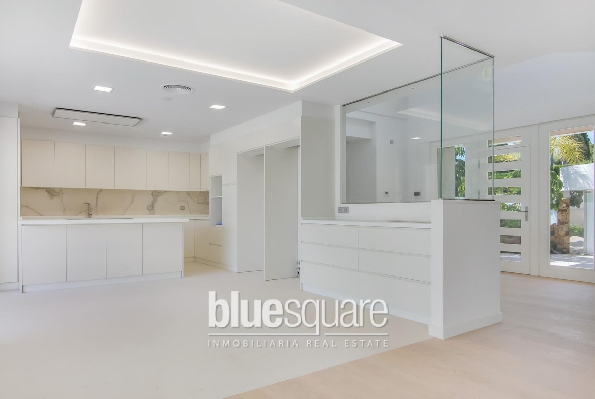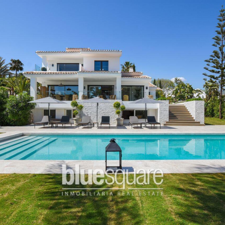 Fantastic newly built villa a few meters from the beach in Bahia de Marbella. The villa consists of a ground floor, a first floor, a roof terrace/ solarium with Jacuzzi and a large basement with sauna, Turkish bath, large spaces for cinema or play room, a complete engine room and a large garage for 5 or 6 cars. On the ground floor we find the main entrance of the villa with a large open hall of 6 meters high, the kitchen/dining room and the large living room, all separated by large windows that allow you to enjoy the outdoor areas from the inside of the villa. There are also two bedrooms with bathroom en suite and a guest toilet on this floor. The first floor includes 3 bedrooms with bathrooms en suite and direct views of the sea, and access to the roof terrace/solarium where you can enjoy spectacular panoramic views of the Mediterranean and “La Concha”, the big mountain of Marbella. The villa is situated in a fantastic private complex with entrance and exit control. The villa also has its own paddle court, a fully equipped pool house with bar, kitchen … The fantastic pool, Jacuzzi and common areas complete this spectacular luxury villa. About 40 minutes from Malaga airport and only 10 minutes from Puerto Banus.