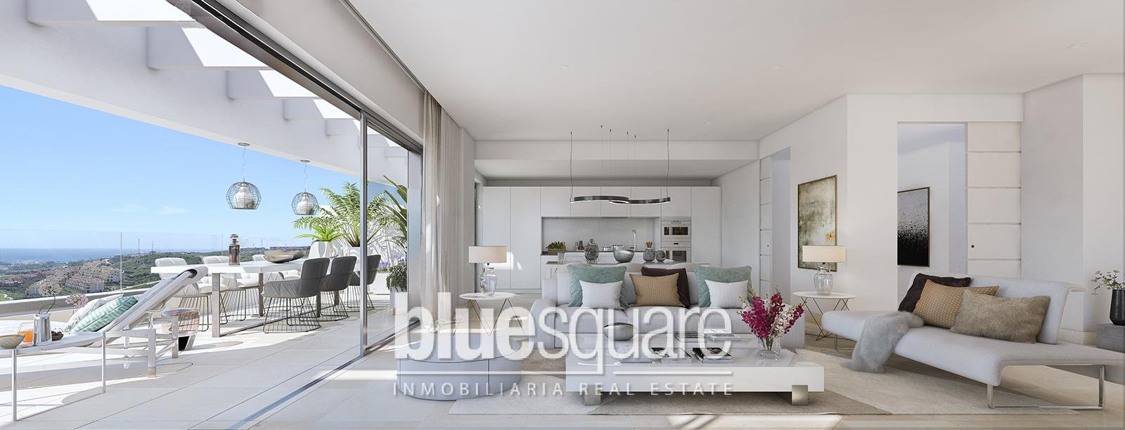 This apartment is located at less than 5 minutes from the beaches and the port of Estepona. Complex with communal pool, fitness room, many green areas and a beautiful view of the sea and the centre of Estepona. The apartment consists of a bedroom, a bathroom, a very large living/dining room and a beautiful open kitchen integrated into the living room. There is a beautiful terrace of 37m2 with panoramic views of the mountains and the sea. Less than 20 minutes from the port of Puerto Banus and 25 minutes from the center of Marbella.
