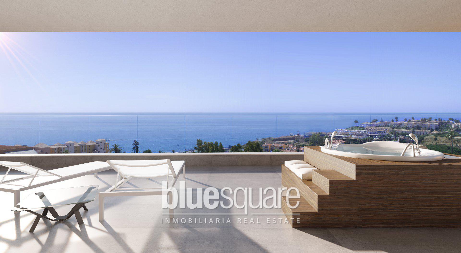New build apartments in Fuengirola, only a 5 minute walk down to the beach as well as other amenities such as the cinema, Myramar shopping centre, bars and restaurants. All apartments have amazing sea views and being in such an ideal location provides great access to everything you could need. The apartment has 3 bedrooms, 2 bathrooms, an open living area finished to a high quality standard and designed to provide ample open plan living and top of the range appliances. The apartment has been designed with a layout that gives you the possibility to enjoy exceptional views at every moment of the day whether you are relaxing on the terrace, cooking or dining. The apartment includes a jacuzzi on the terrace that lets you make the most of the wonderful views in your private tub. The apartment has a very high quality finish as well as features such as zone air conditioning and underfloor heating. All the apartments come with two underground parking spaces. The complex offers multiple facilities such as beautiful gardens multiple communal pools including an infinity pool and a roof top pool, a gym, Sauna, an Indoor pool for all year round swimming and Turkish baths. Which gives you an ideal space to kick back and relax. Their will be a gastrobar, with fire pits and two exclusive club house area giving you somewhere to be social with your friends when you need it all year round.