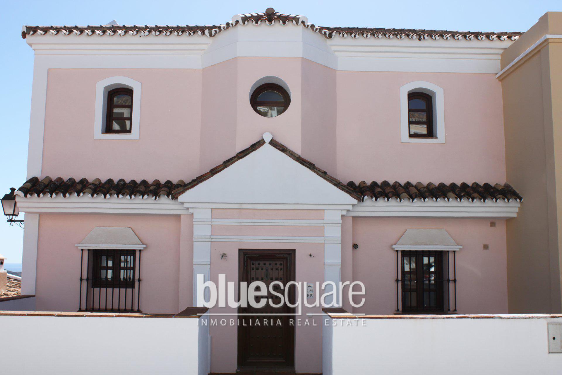 Townhouse with sea views in Benahavis. It is located in an urbanization that looks like a small village consisting of similar houses on the heights of Benahavis. It is part of an urbanization composed of villas and plots. The entrance is secured and gated. The house is built on 2 floors – On the ground floor there are 2 bedrooms and 2 bathrooms and a large terrace. – Upstairs is a large living room with a fireplace, a kitchen and a south-facing terrace that offers magnificent views of the hills and the sea. The house is equipped with a gas under floor heating system. There is also a swimming pool. The residence is located in the heights of Cancelada, 7 minutes drive from shops, restaurants and the beach. It is a quiet place a little away with great views.