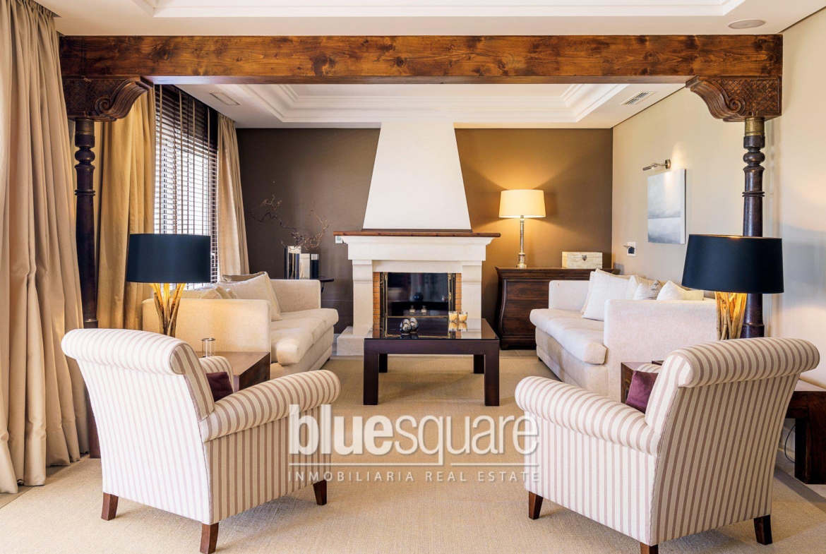 This beautiful Andalucian Villa is of extraordinary style and character. Based in the famous Golf valley, it boasts both amazing Sea, mountain and Golf views, and is surrounded by world class golf courses, some of the finest that Europe has to offer. This extraordinary property boasts 5 very spacious bedrooms, 6 very large and characterized bathrooms and 1 guest toilet. The villa has been built using only the very best of world class qualities, from its wooden coffered ceilings, to the use of hand carved cobble stones and natural rocks. It obtains 2 tones sirocco wooden passage doors throughout, that masterfully combines with outstanding Sevillan marble floors. This superb property obtains a beautiful lounge/living area with fire place, independent dining area, cellar, a beautifully designed high end kitchen and breakfast bar utilising world class appliances from Siemens and Gaggenau. Not enough to mention the above, it also obtains under floor heating, air con hot/cold, a lift from the spacious garage are to both floors of the property, a Turkish bath, Sauna and Spa, Swimming pool, 2 car double garage and parking area, dual line telecoms including adsl, surround sound music throughout, a beautiful porch that runs the full length of the villa, and beautiful manicured garden area, but to mention just a few factors. It is sited in a luxurious golfing community, with Puerto Banus just 10 minutes away, Malaga Airport 50 min, Shops, supermarkets and school are found very close by and is just a mere 3kms from the main road to all directions. This extraordinary property is also sold fully furnished and decorated as seen. This property is of rare character, embodies opulence and represents outstanding upturn investment. A definite must see when desiring to reside in one of the best communities based on the Costa del Sol.