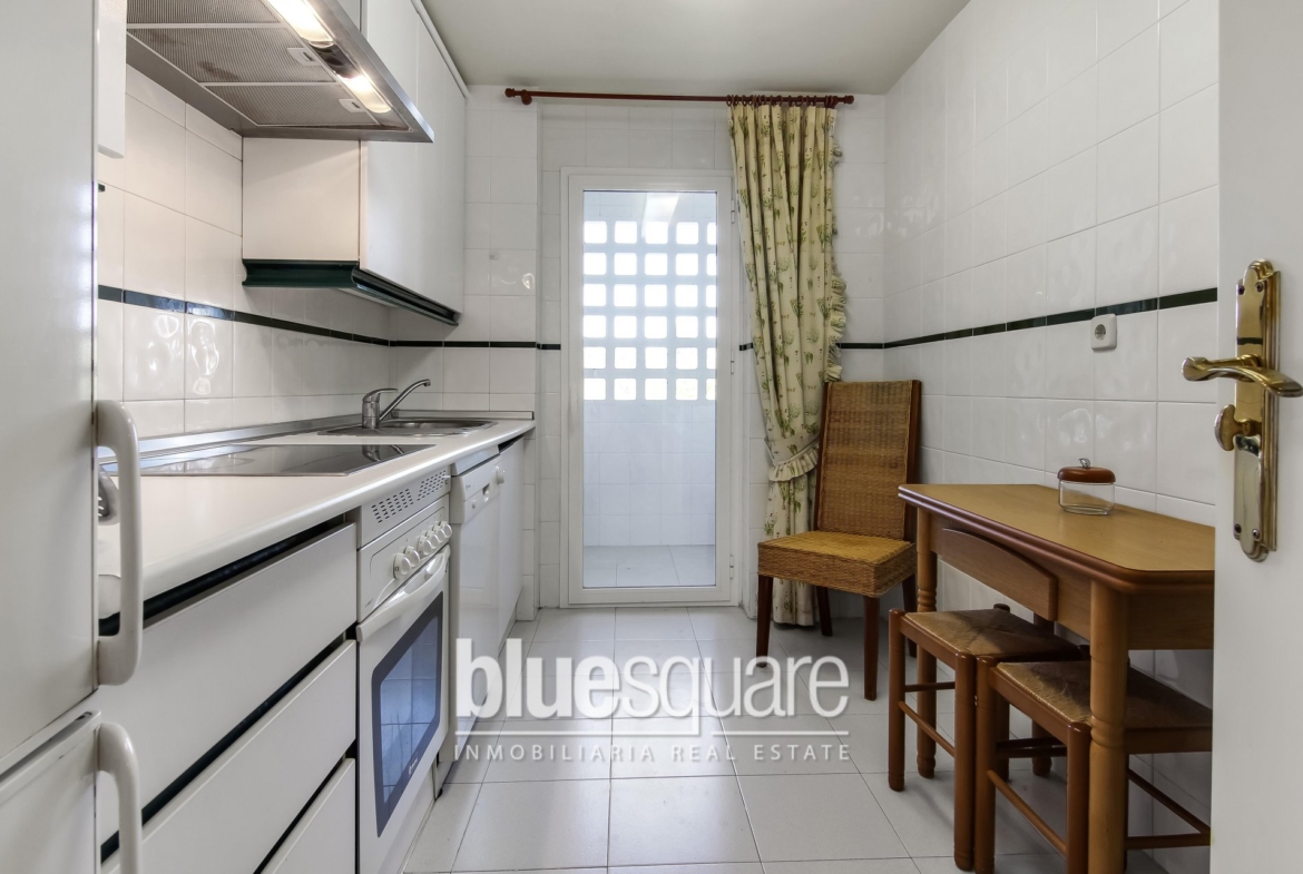 This apartment is located a few minutes walk from Puerto Banus, Marbella. The urbanization is located close to several of the best golf courses in the area, and the international Aloha school is only a few minutes away, and all kinds of supermarket and services around. It has two large pools, large gardens, and children’s area next to the restaurant of the urbanization. Padel courts, 24 hours security. Come and live in Marbella! Ten minutes from the old town of Marbella, The apartment is on the second floor, large glazed terrace, it has three bedrooms, two bathrooms, fully equipped kitchen, living room, marble floors, sold with private parking space valued in €20,000.
