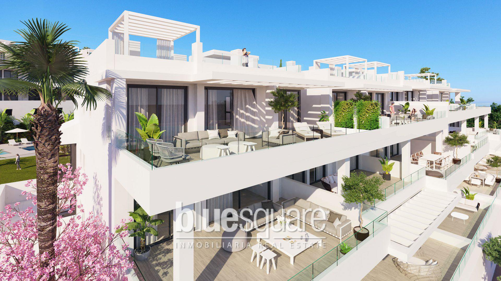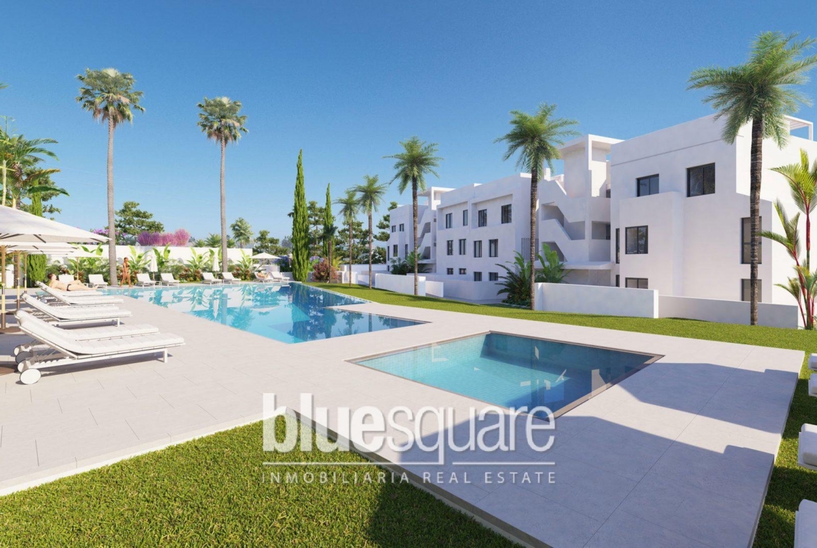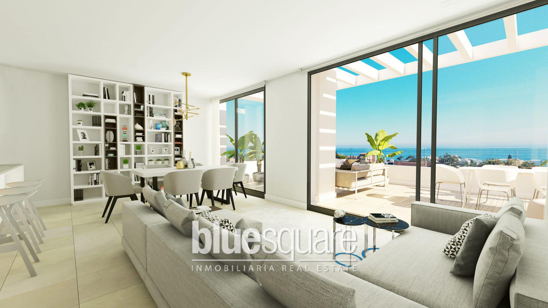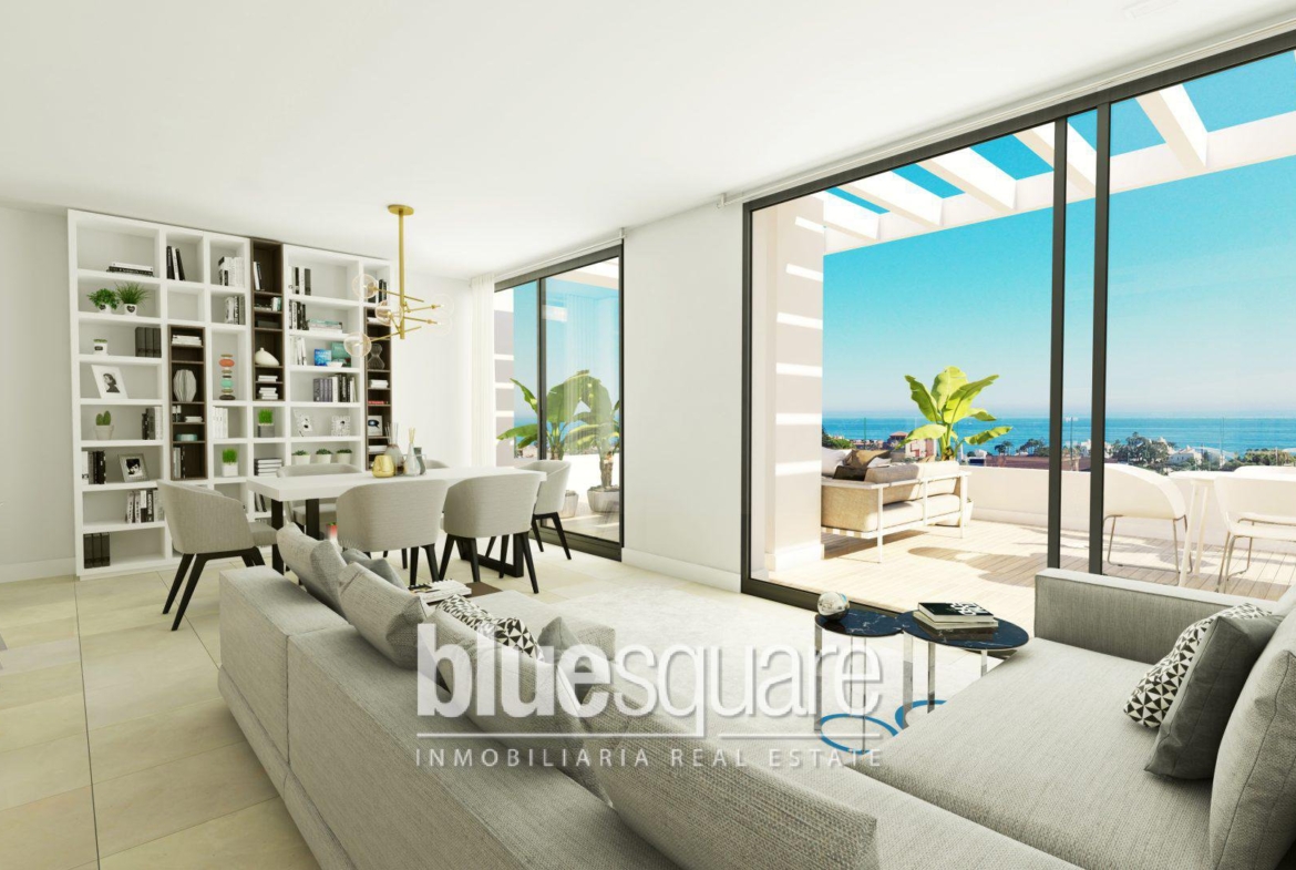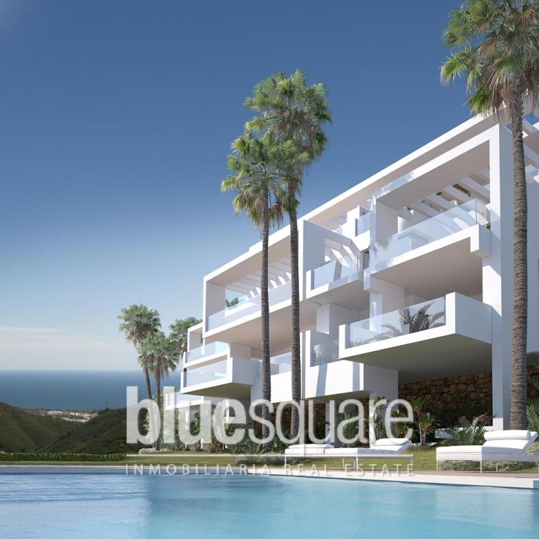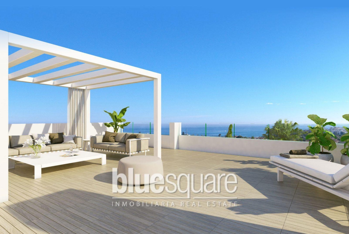 This very spacious 2 bedroom apartment has a bright living room, a very modern American kitchen and a large sunny terrace. The development has a superb saltwater pool and a tropical garden. This new development of 48 apartments with innovative and avant-garde design is located southwest of Estepona, a few minutes walk from the beach and shops, and near the Estepona golf. From the residence you have a superb view of the bay of Estepona. Enjoy a lifestyle with tranquillity in a secure enclave only 500 meters from the sea and 5 minutes from the centre of Estepona.