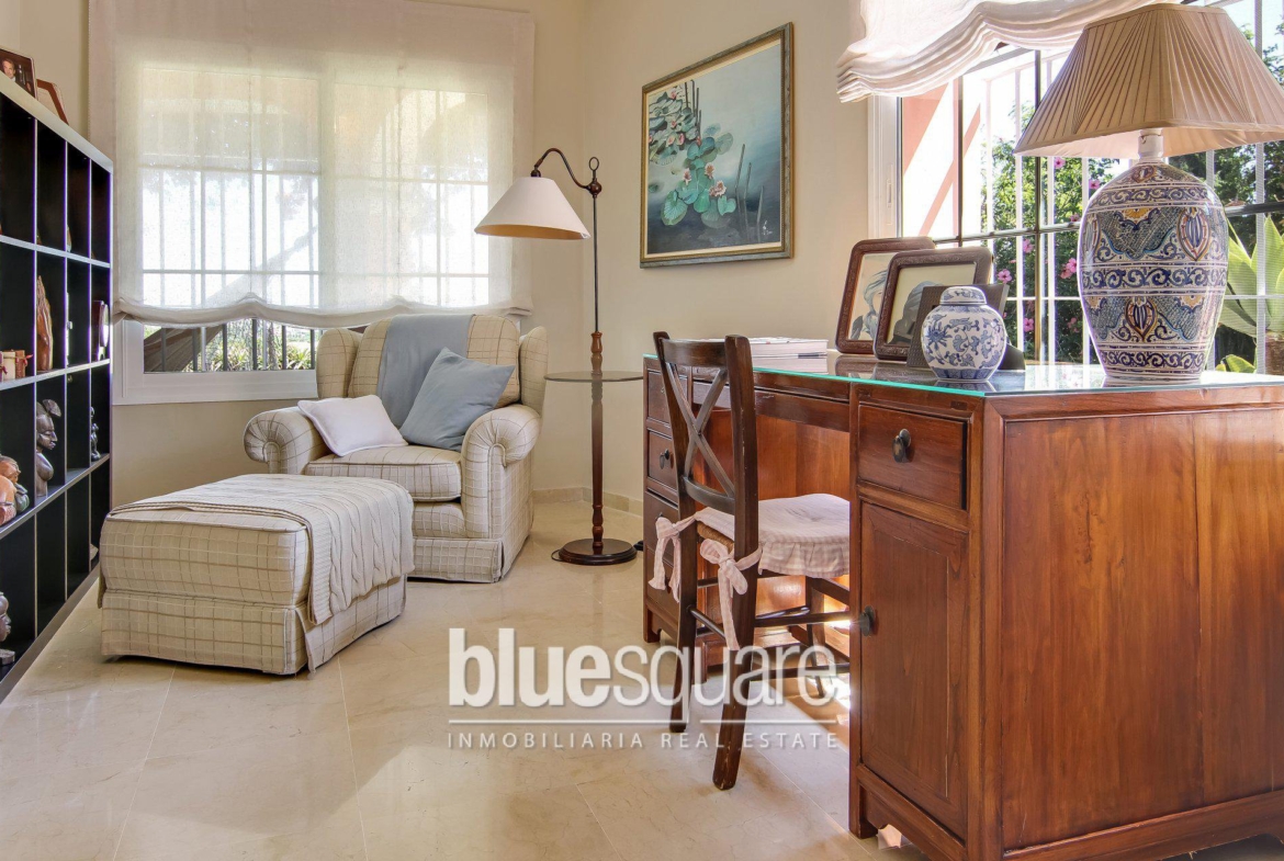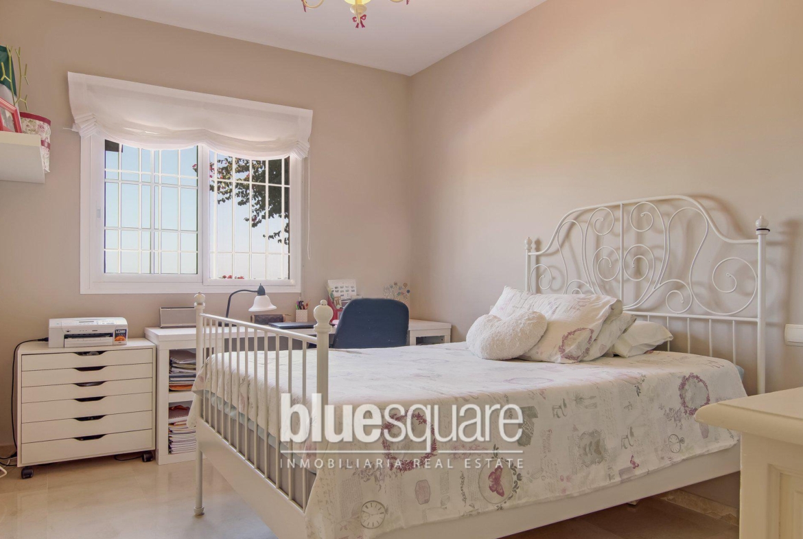 This beautiful detached villa is located in Mijas golf only a short distance away from multiple amenities. Fuengirola and la Cala de Mijas beach can be reached in less than 10 minutes as well as easy access to multiple prestigious golf courses, shops and shopping centres. The villa itself is located in a very secure community that has 24h security and is very peaceful area. The villa is built on one floor and has 4 bedrooms all with built in wardrobes, and 3 luxurious bathrooms. There is a separate fully fitted kitchen that leads out onto the back terrace and open plan living area which leads out onto the front terrace. The large doors that lead to the terrace provide a bright and airy atmosphere to the living room. The terrace has a beautiful panoramic view of the sea and the valleys of Mijas. The garden is laid out over two levels, the upper level which you access from the terrace has a beautiful view at every angle and holds multiple fruit trees and flowers. The lower level gives access to the terraced private pool area which also has the beautiful view as well as lounging area. To access the villa there is a secure gate where you can enter to the carport and the additional parking space. There is also space to park an extra car on the driveway.