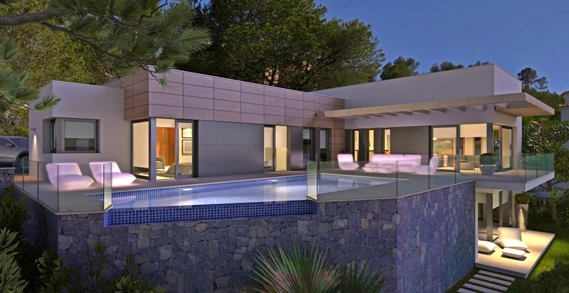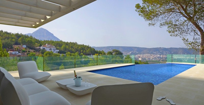 Elegant modern villa, with straight lines in a prominent location in Javea. The property combines avant-garde elements with classic materials and features a bright open plan living/dining area with American kitchen, 3 bedrooms and 2 bathrooms (the spacious master bedroom with dressing and en-suite bathroom). All the rooms have direct access to the pool terrace with a large infinity pool. There is a spacious basement of +/- 72 m2 that can be converted into a gym, home cinema or separate guest apartment (additional cost of 85,000€).