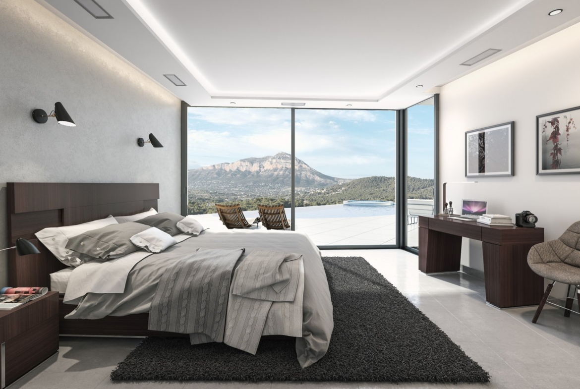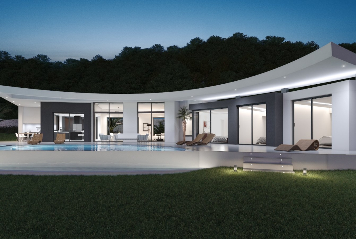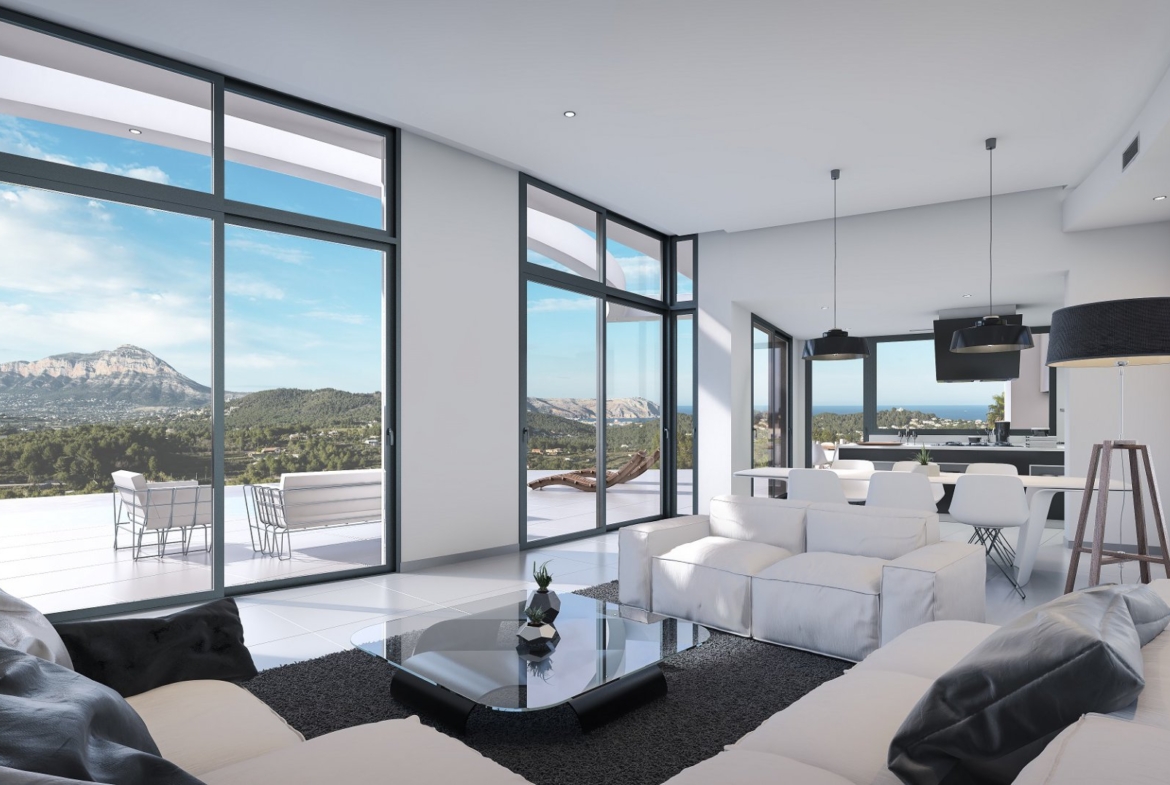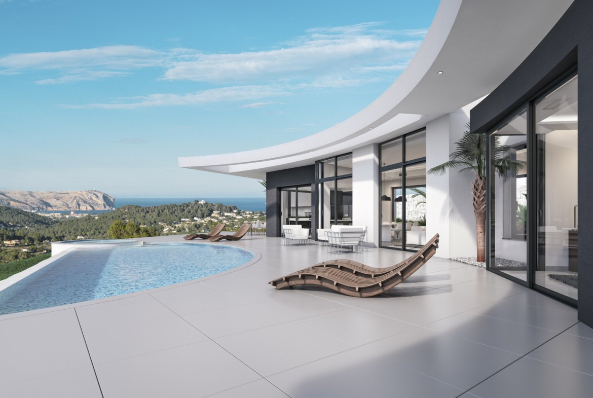Spectacular modern villa located in a quiet residential urbanization, only a few minutes away from Javea Golf Club and only a short drive to the beaches of Javea and Moraira. The villa offers great panoramic views to the mountains, the valley and the sea at the horizon. The villa on one level with 263 m2 of living space consists of a spacious and bright living/dining room with high ceilings and panoramic windows, open plan fully equipped design kitchen, guest toilet and 4 spacious bedrooms with fitted wardrobes and en suite bathrooms. The property also includes a large terrace, designer infinity pool with luxury Jacuzzi, outdoor kitchen with BBQ, carport and a basement with a large storeroom and engine room. Beautiful designed villa, built with high quality materials and equipped with the best fittings.
