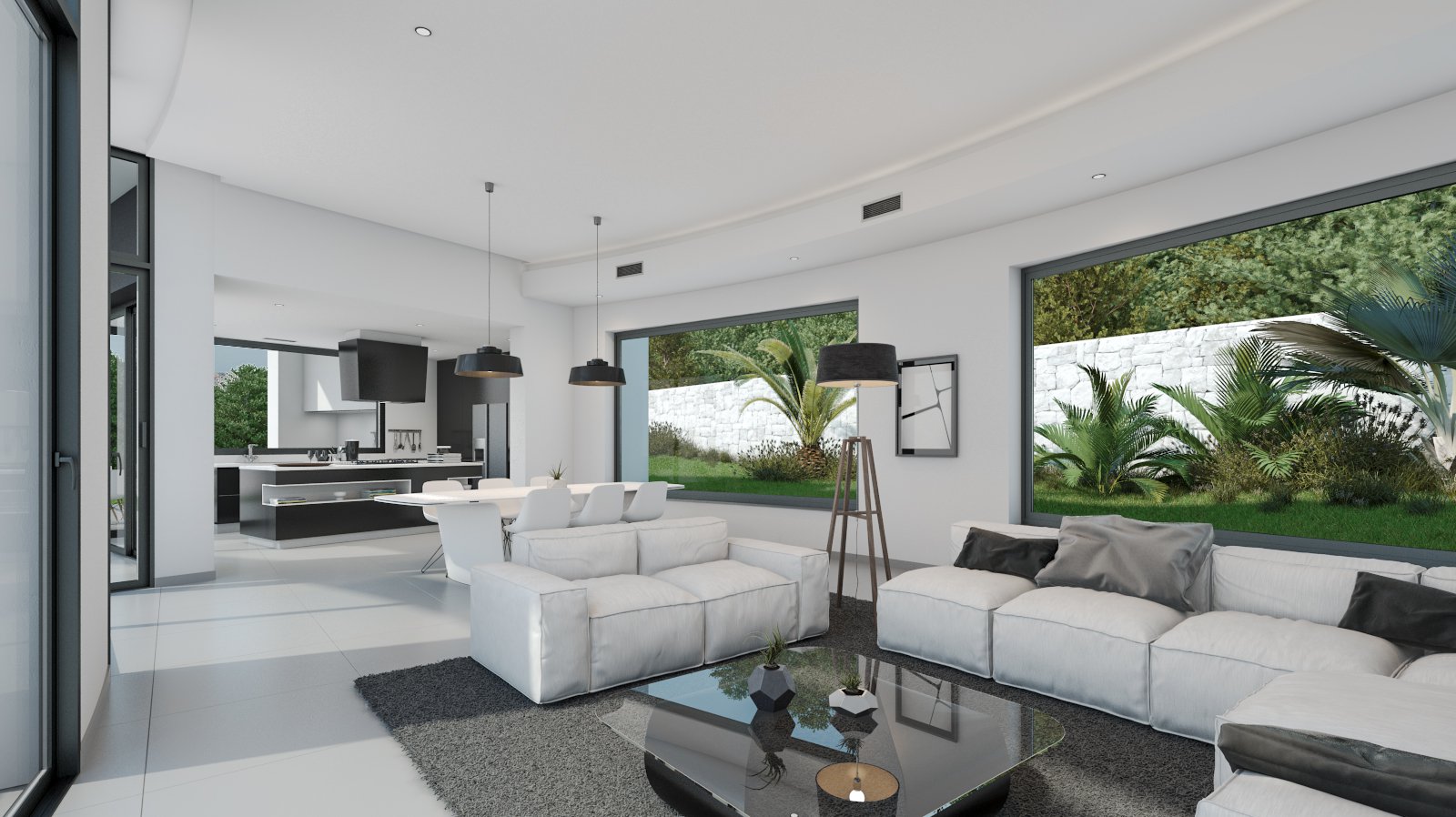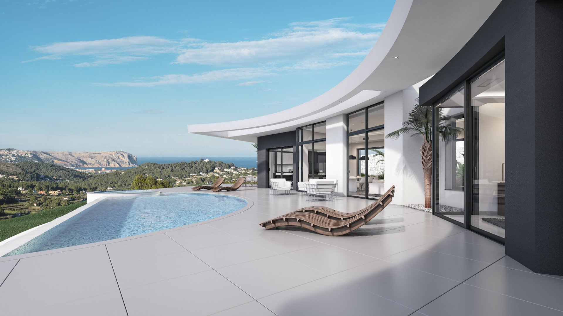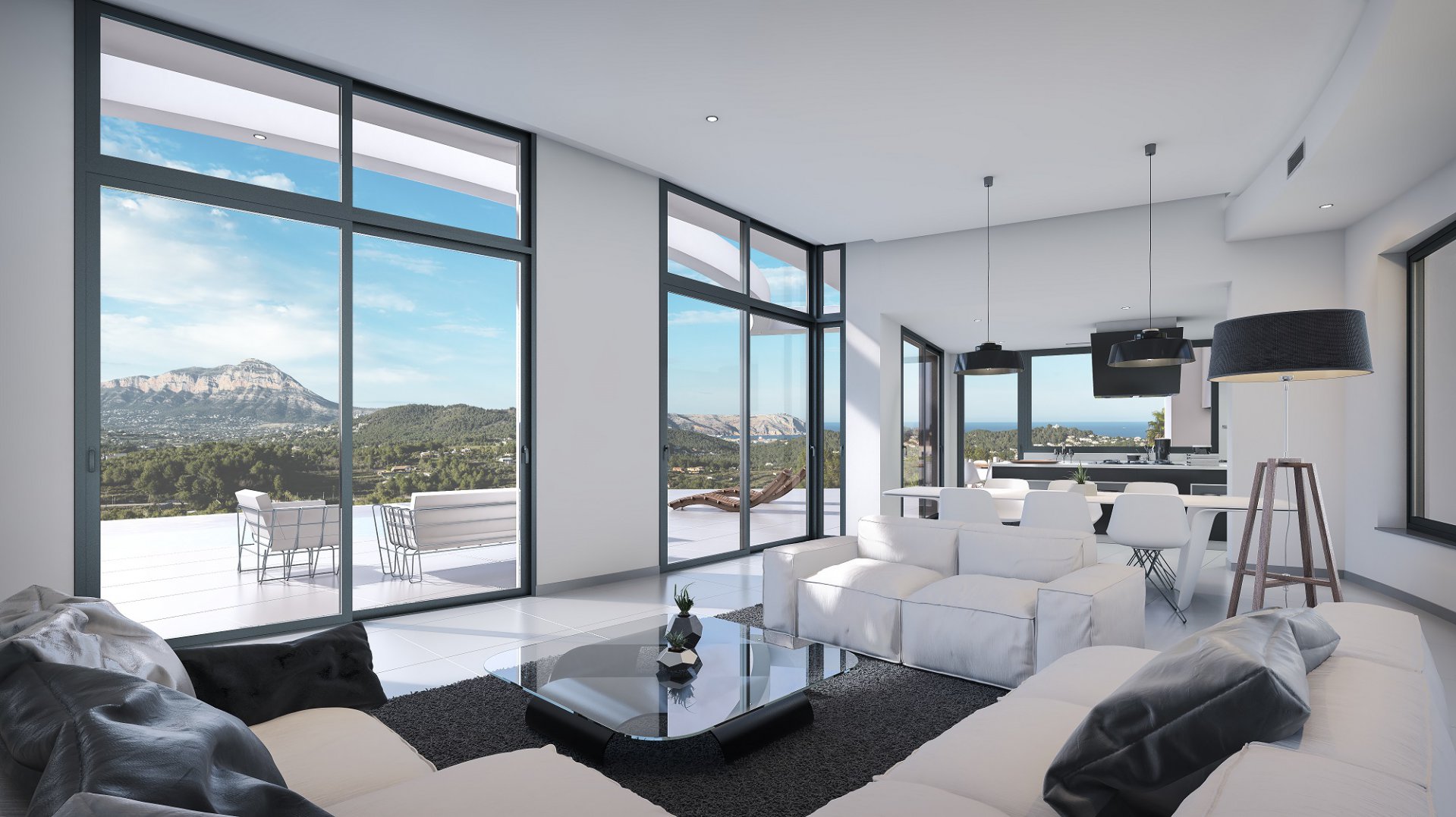 Spectacular modern villa located in a quiet residential urbanization, only a few minutes away from Javea Golf Club and only a short drive to the beaches of Javea and Moraira. The villa offers great panoramic views to the mountains, the valley and the sea at the horizon. The villa on one level with 263 m2 of living space consists of a spacious and bright living/dining room with high ceilings and panoramic windows, open plan fully equipped design kitchen, guest toilet and 4 spacious bedrooms with fitted wardrobes and en suite bathrooms. The property also includes a large terrace, designer infinity pool with luxury Jacuzzi, outdoor kitchen with BBQ, carport and a basement with a large storeroom and engine room. Beautiful designed villa, built with high quality materials and equipped with the best fittings.