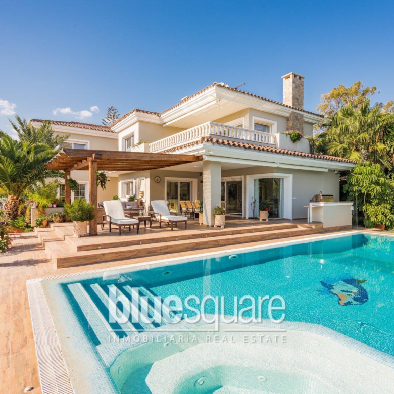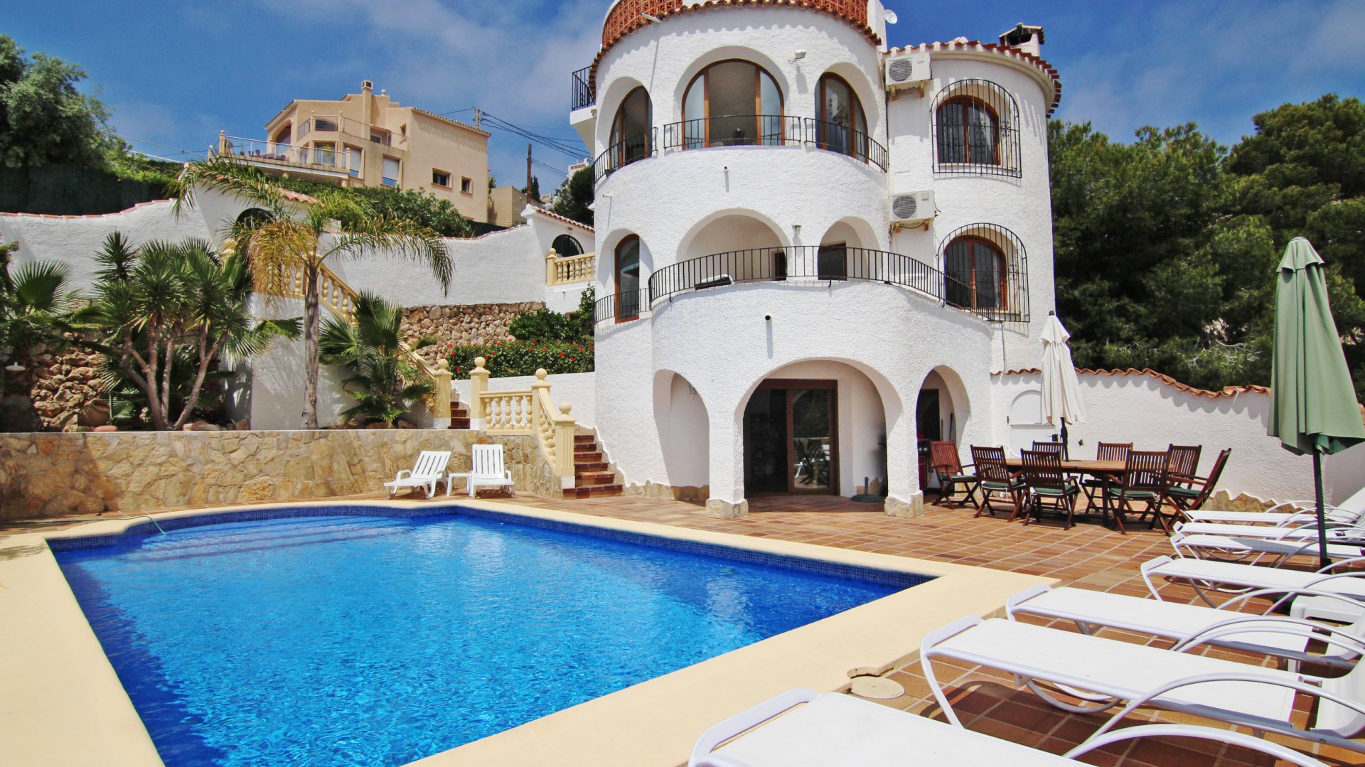 Exclusive to Blue Square! This fantastic family villa offers an abundance of space split over 4 floors with amazing sea views! On the main floor is a large lounge with fireplace and aircon leading to a covered naya overlooking the sea! Also a fully fitted galley kitchen. In addition, there are two double bedrooms with built in wardrobes and ceiling fans (one with small balcony) One bathroom with shower between the two bedrooms. On the second floor there is an additional large living room with double doors to the driveway. A large hallway leads to the master suite which has its own covered naya, dressing room with built in wardrobe space in abundance and en suite bathroom with shower. This room has an open fireplace, aircon and radiators. There are two further double bedrooms on this floor, both with aircon, radiators and built in wardrobes. One bathroom with shower between these two bedrooms. On the third floor is a 10 x 5 pool with large terrace and a separate large apartment with living area, american style kitchen, bathroom with bath, storeroom and double bedroom with separate dressing room. The apartment has aircon. Finally on the top floor is a sun terrace with breathtaking views over the sea offering the ultimate in tranquility…..