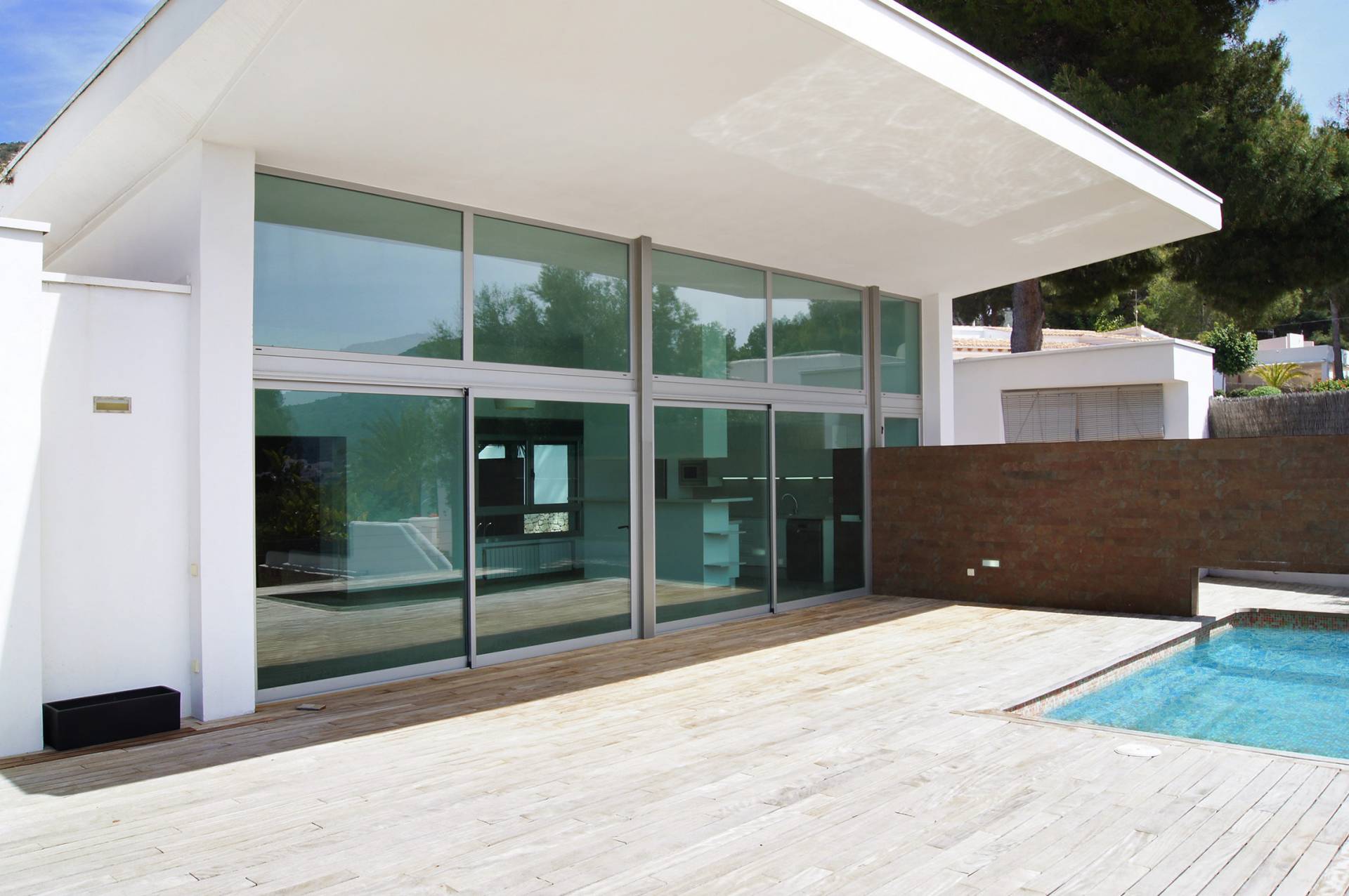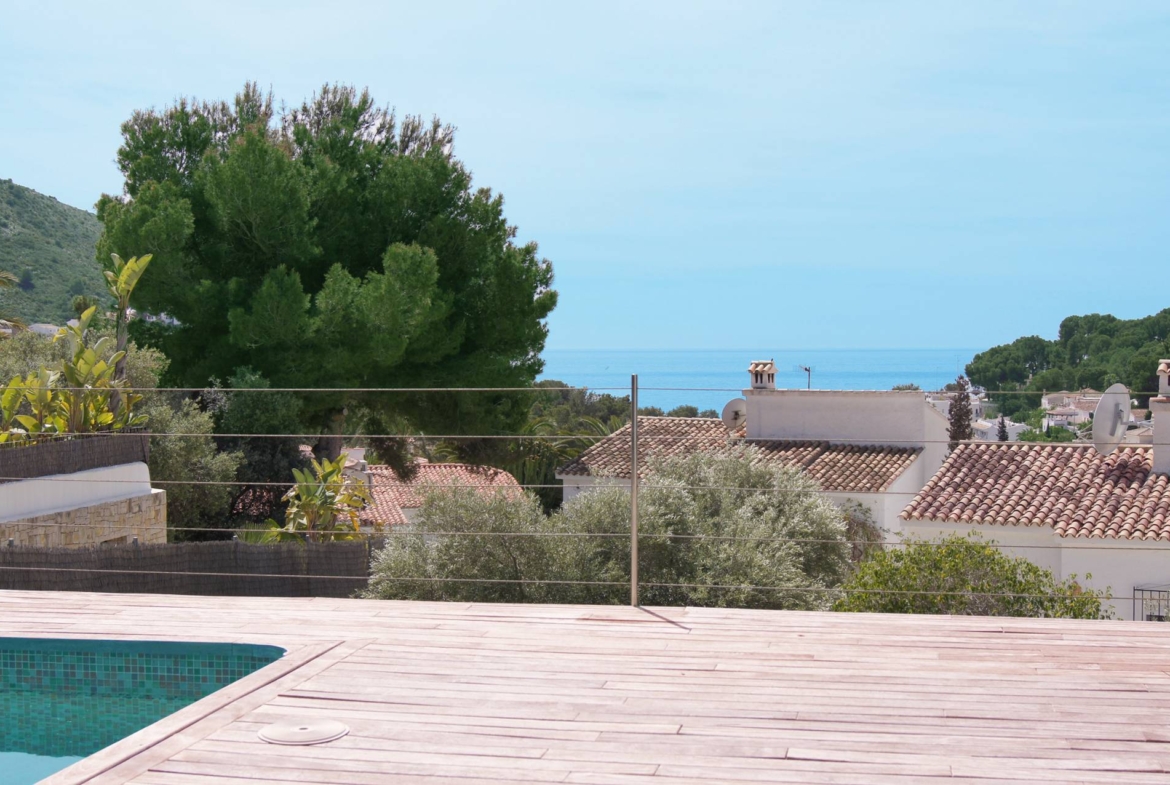 Modern villa with sea views within walking distance to the El Portet beach and the town of Moraira. The open plan living room and fully fitted kitchen are separated from the wooden decked terrace by large sliding windows, benefiting from great views and sunlight throughout the day. On the same level, there is the master bedroom with sea views, another bedroom and a study. Downstairs a 3rd bedroom, shower room, a huge games room / cinema room and the garage.