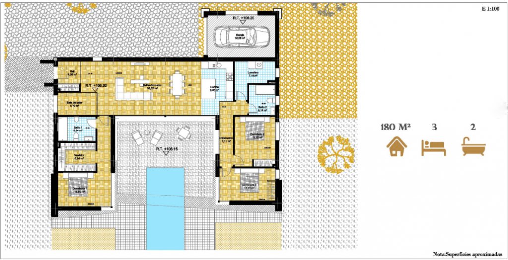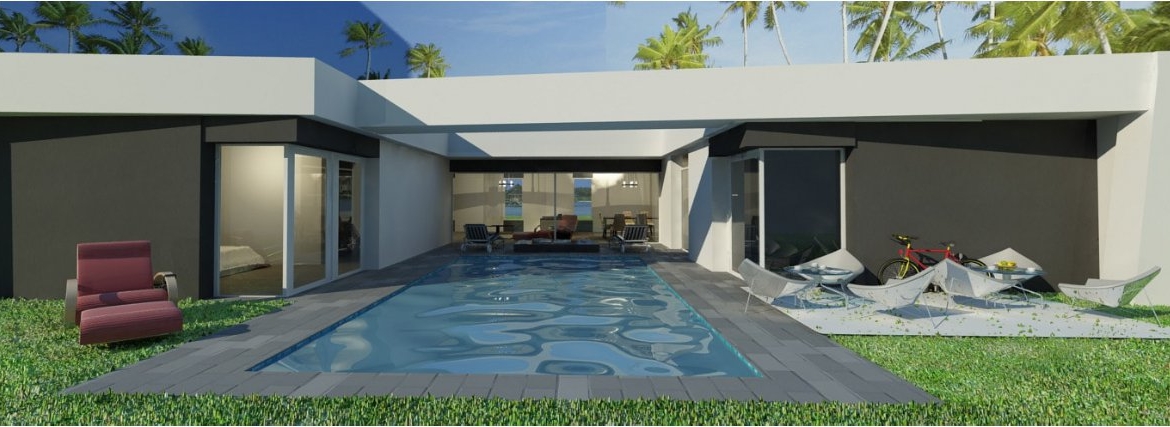 The villa has a large living/dining room with integrated kitchen, 3 bedrooms and 2 bathrooms (one en-suite), a small office, a pantry and a garage for one car. The design is U-shaped, surrounding the pool, so that from all the rooms there is a view of the garden. The project can be completed in 10 months. The pool and garden are not included in the price. The construction on the slope plots may generate additional costs for technical and municipal facilities. The price may vary depending on the materials used and chosen.