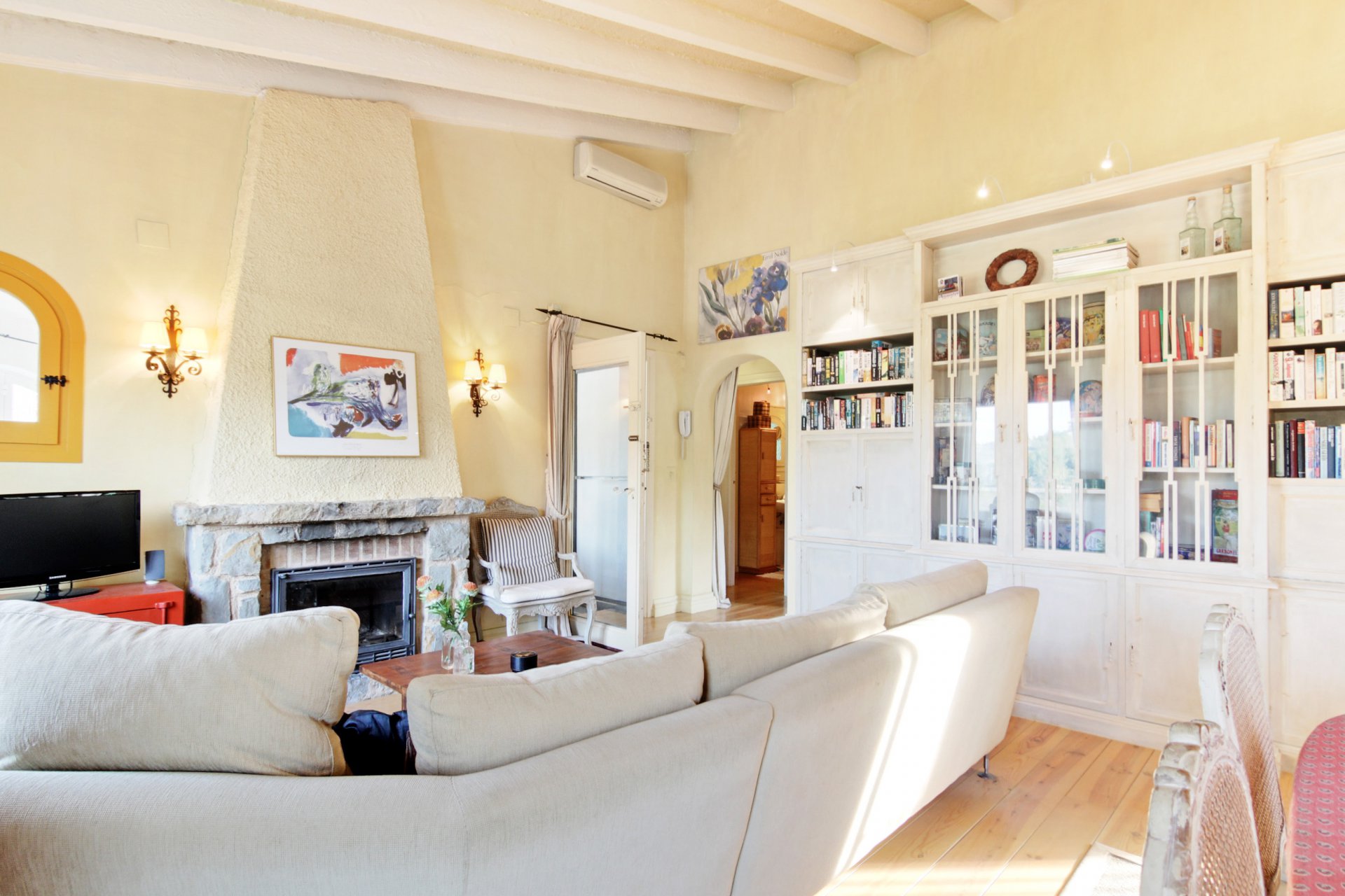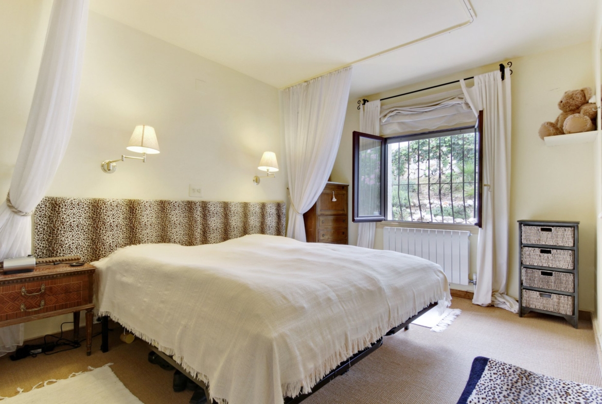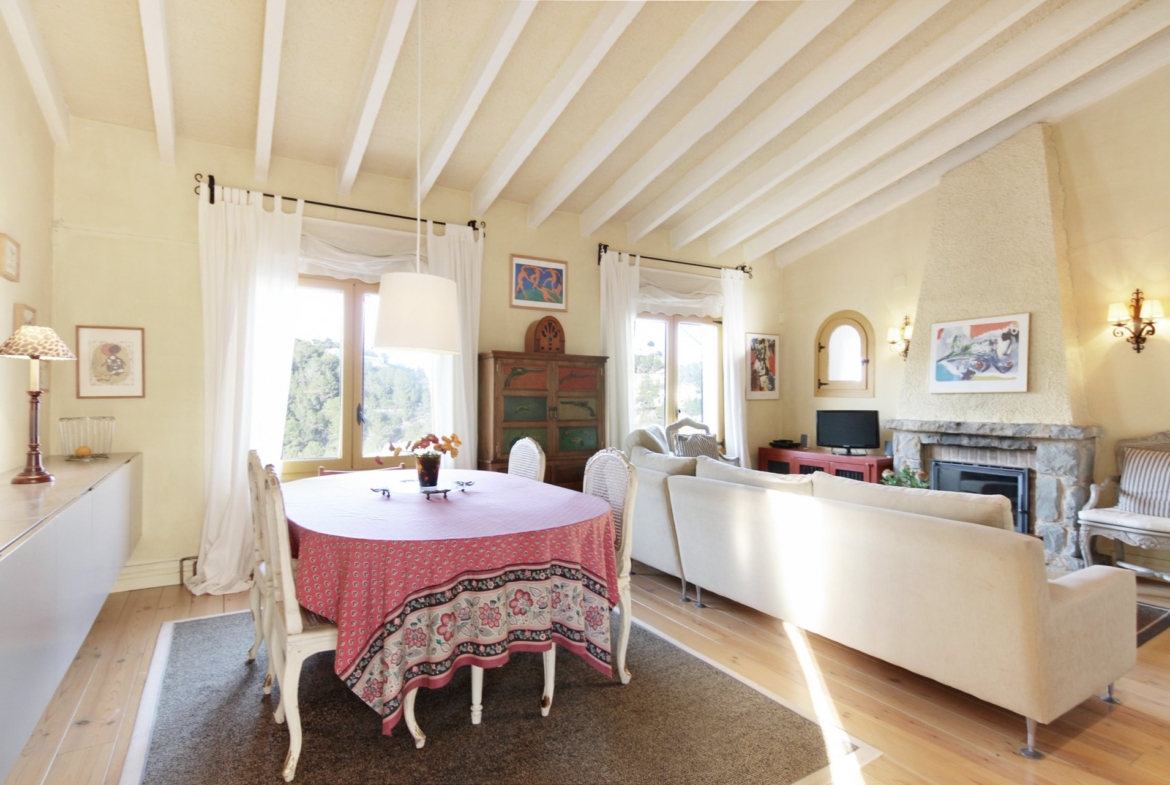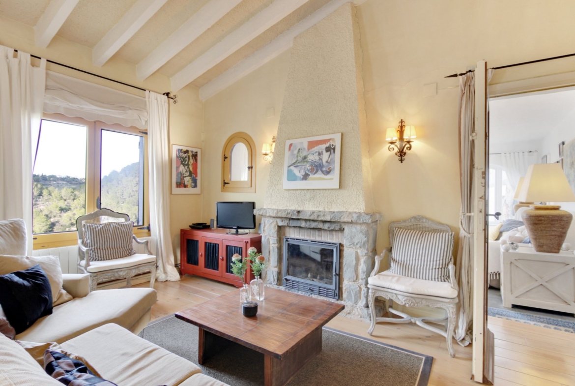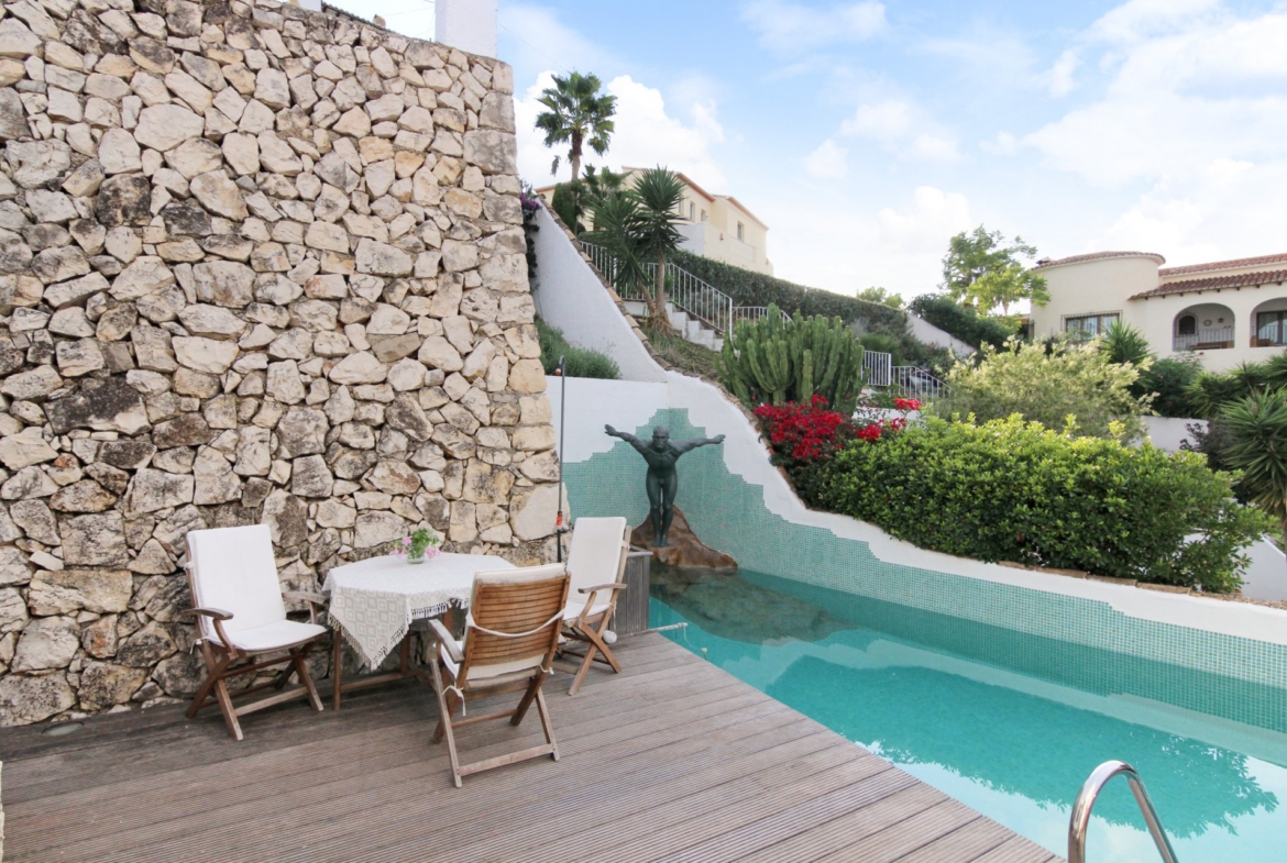 Beautiful two-storey villa in Montemar with amazing views towards the sea, Moraira and El Portet. The villa has a lot of original features and a welcoming feel. On the main level are two double bedrooms with built-in wardrobes, a bathroom, separate kitchen, large dining/living room with fireplace and high ceiling with wooden beams and a spacious glazed in Naya with great views of the valley and the woodland and leading onto a beautiful sun terrace offering amazing views of the sea, Moraira bay and the hills. The downstairs level features two spacious studio apartments each with a shower room. One of the studios has a small kitchenette and the other one has a fully fitted kitchen. Both studio apartments have external separate entrances and there is a connecting door between both studios, so they can be used individually or as one large apartment. The property also includes a low maintenance garden with several sitting areas around the house for sun and shade, hardwood decking main terrace, pool shower, infinity pool with a striking statue and parking for two cars.