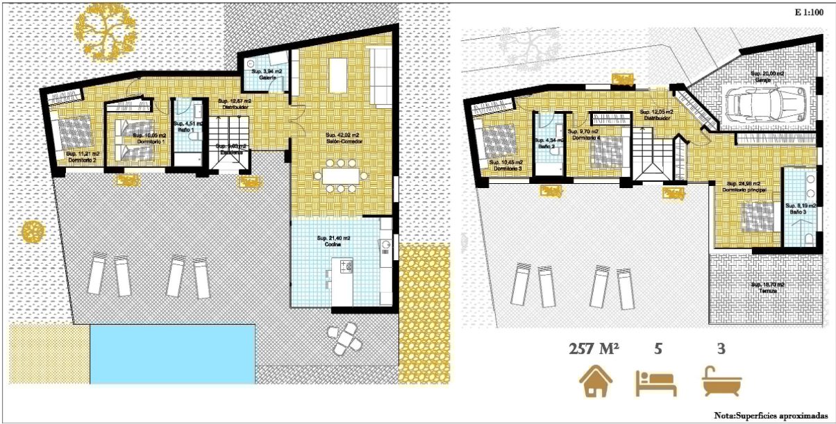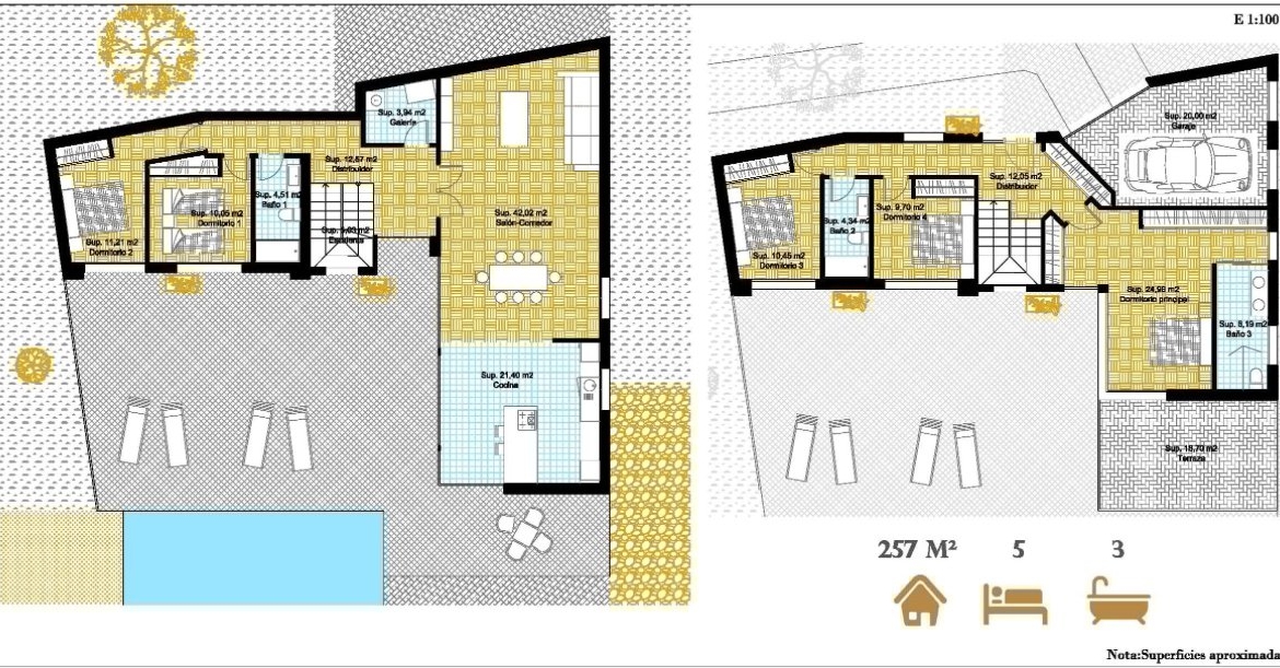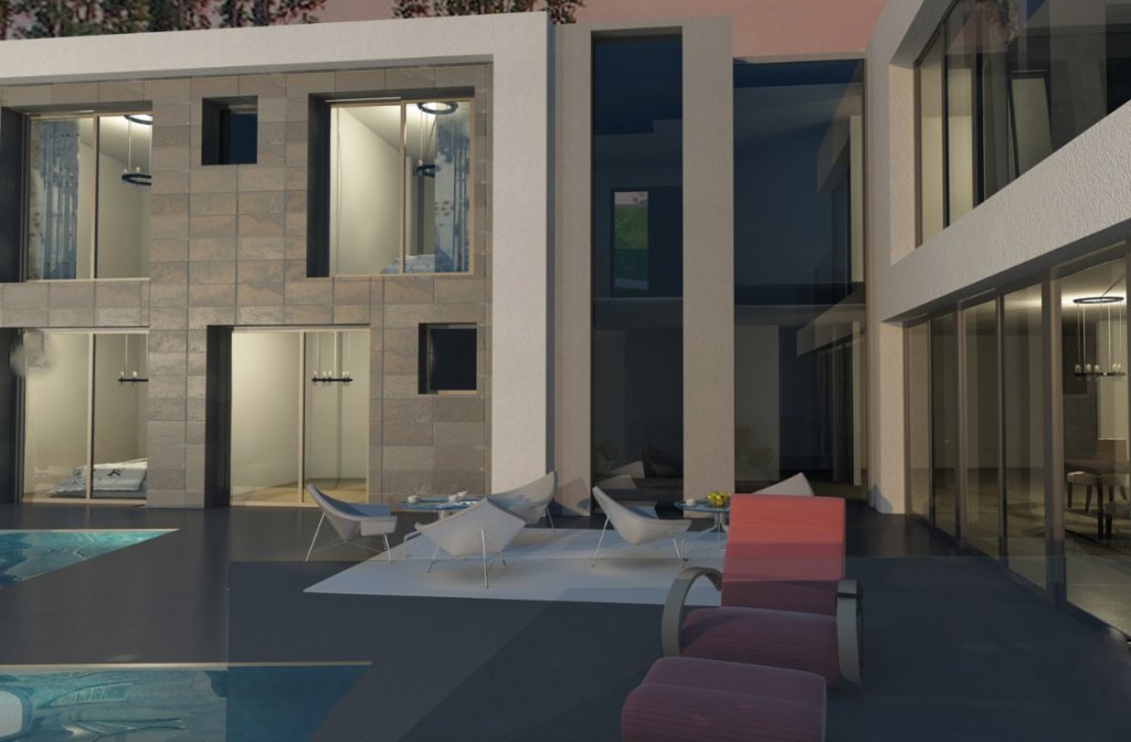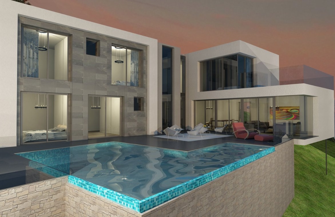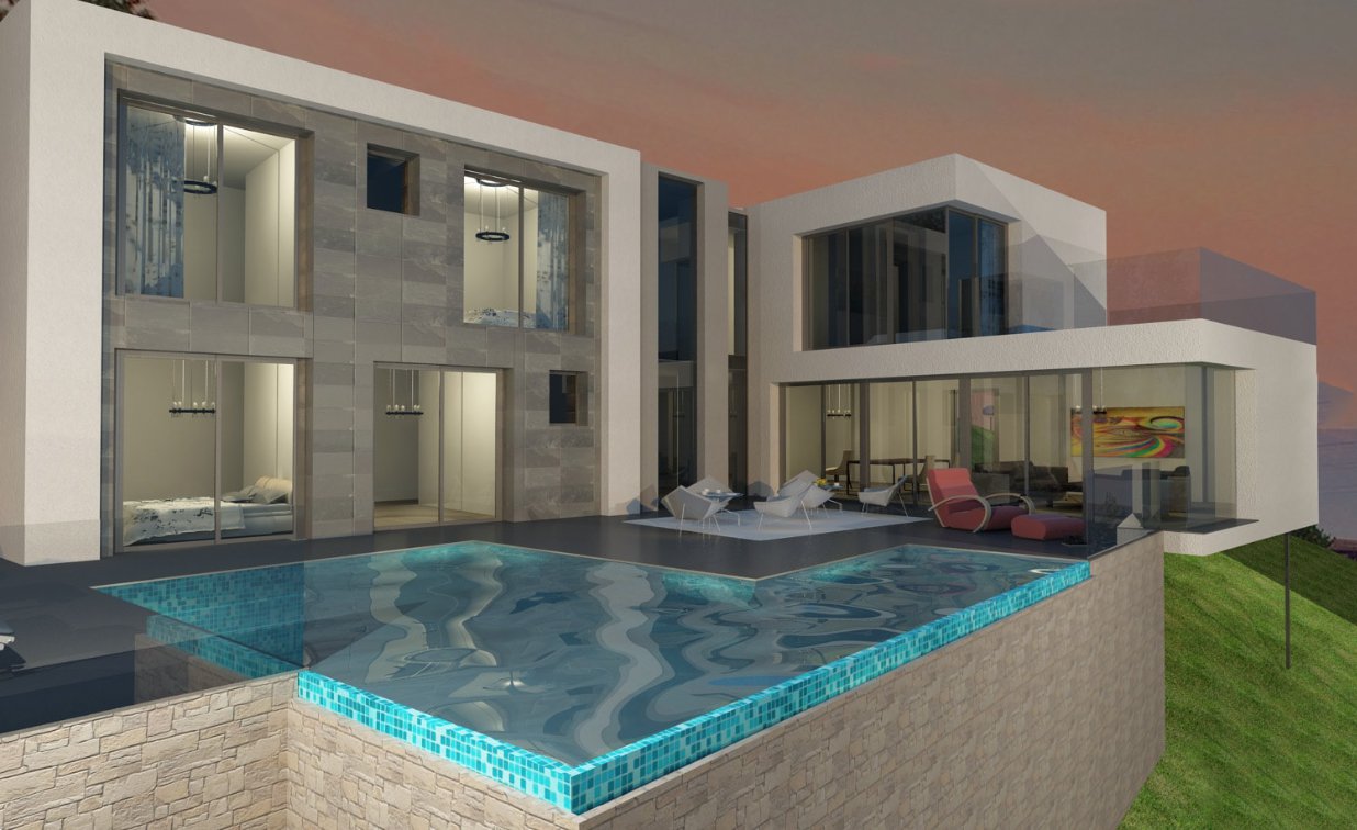 This modern villa disposes of a large living/dining room with open plan kitchen, 5 bedrooms and 3 bathrooms and garage for 1 car. The living room communicates with the large outside terrace with infinity pool. The pool and garden are not included in the price. The construction on the slope plots may generate additional costs for technical and municipal facilities. The price may vary depending on the materials used and the plots.