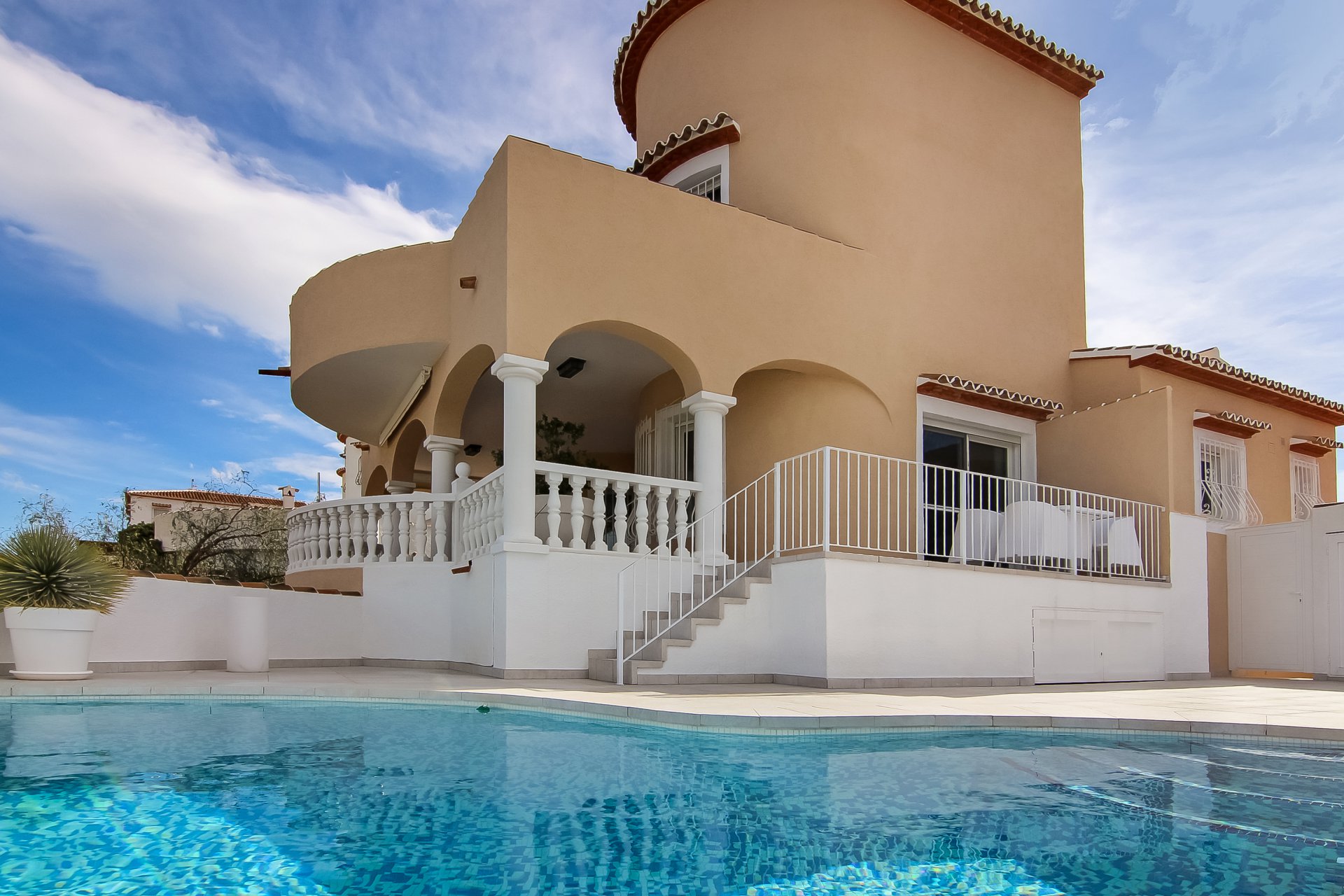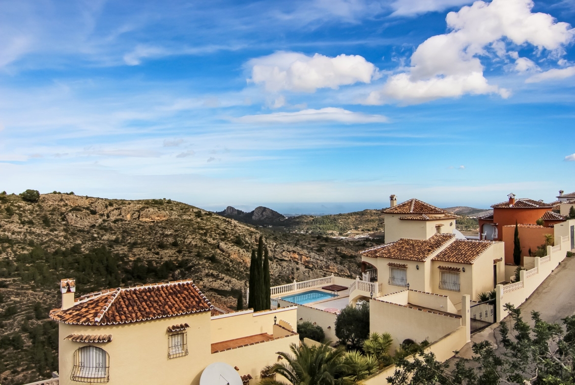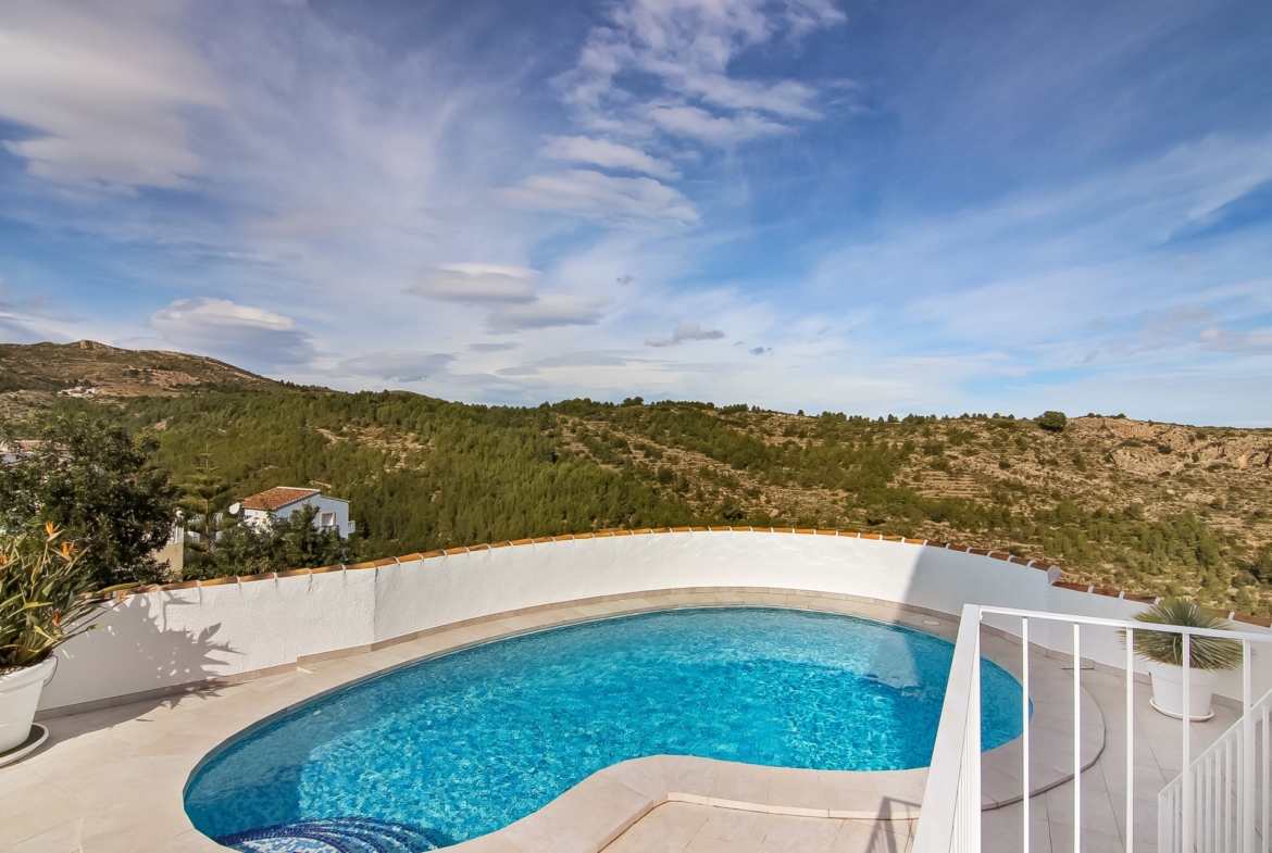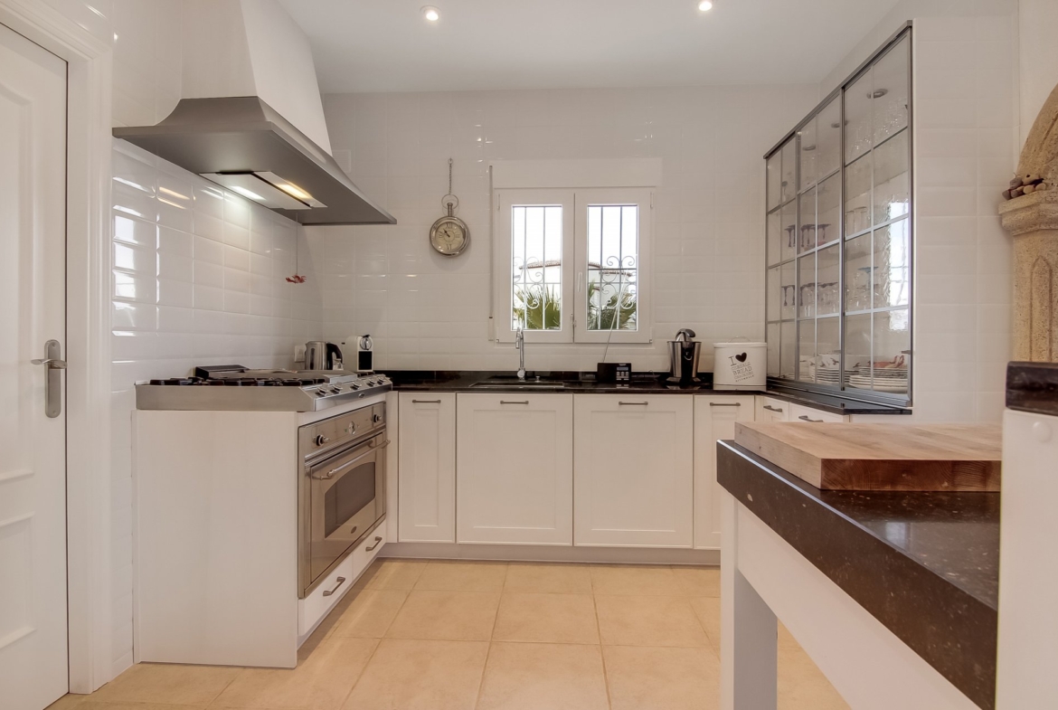 This house, built in 2004, has been beautifully renovated in 2016 with the best materials. The house is overwhelmed with light and consists of a bright dining room with American kitchen with a storage room, which offers beautiful views of the mountains and the sea. The dining room connects with the living room with a beautiful fireplace. The ground floor also features 2 bedrooms and a bathroom. Upstairs there are 2 bedrooms with en-suite bathrooms. The master bedroom has a beautiful dressing. Both bedrooms have access to a nice terrace, which offers the outstanding views. The property also includes a large Naya overlooking the heated kidney-shaped pool, an outside shower, several terraces and spacious storage rooms.