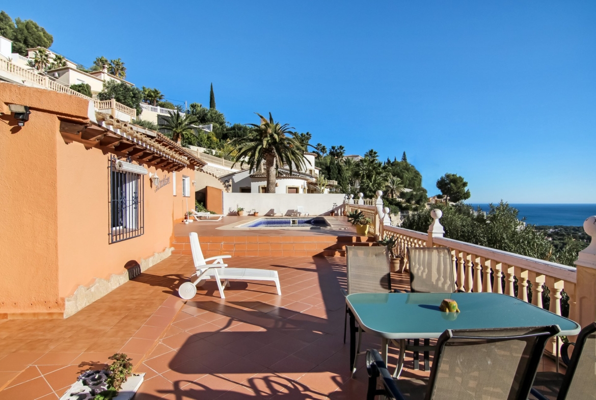 Detached villa with 3 bedrooms and 3 bathrooms in the “Benimeit “ area of Moraira. This south facing property has unrivalled panoramic views to the sea and the surrounding countryside. There is a large terrace and private swimming pool that takes advantage of the fabulous view and there is also ample off-road parking space for 3 cars. A second floor can be built if required