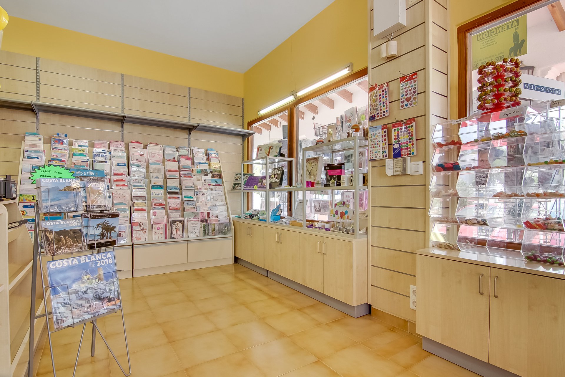 Very busy freehold newsagent shop in the Tabaira area of Moraira. Surrounded by bars, shops and restaurants this well established business not only provides local residents with their daily newspapers and magazines. Greetings cards, stationary supplies, confectionary and drinks are also on sale as well as a postal service, fax and copy facilities, telephone top ups and cigarettes. Move in and start earning from day one from this ready made business with a large customer base.