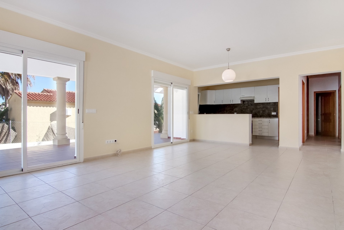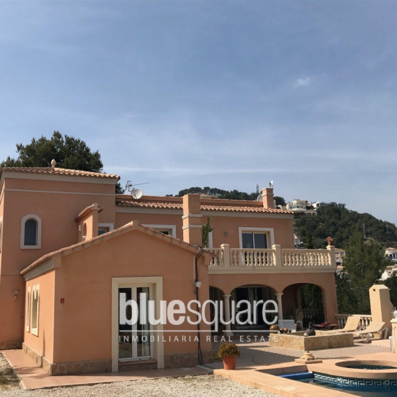 This 3 bedroom, 3 bathroom villa has been recently finished, using only high quality materials, fittings and fixtures, and lies right on the border of Moraira´s famed San Jaime Urbanisation, only a few minutes walk from the Golf course, many bars, restaurants, a supermarket, and only about 1.4 km from the beautiful Baladrar beach. The ground floor boasts a large american kitchen and living area, which opens out onto the pool and terrace area, as well as two bedrooms and two bathrooms. Upstairs the master bedroom has a large en-suite bathroom as well as two large terraces, on looking up the hillside, the other down to the sea. The high walls around the property offer privacy and security.