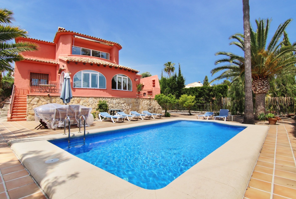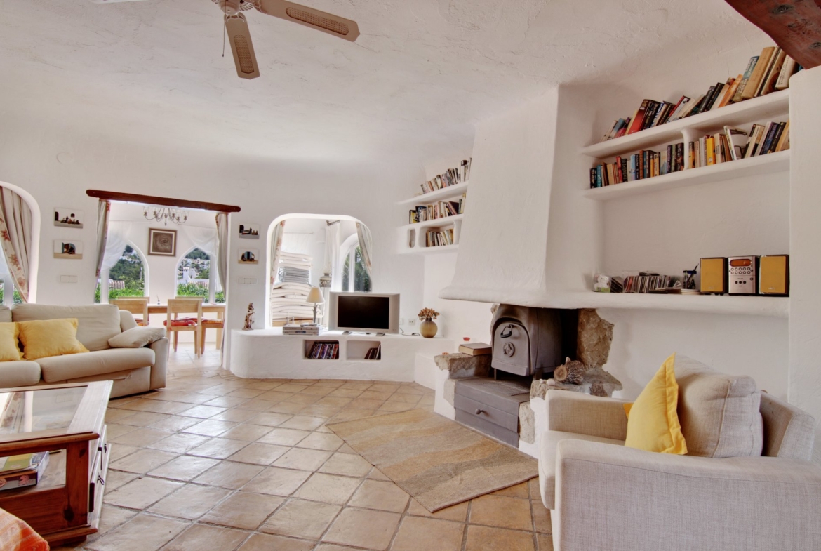 Beautiful, cosy villa of 180 m2 on a fenced plot of 800 m2, close to the centre of Moraira and within walking distance to the local commercial centre. The villa on two levels consists of 4 bedrooms, 3 bathrooms, living/dining room with fireplace, kitchen, porch, several terraces and a separate guest apartment.