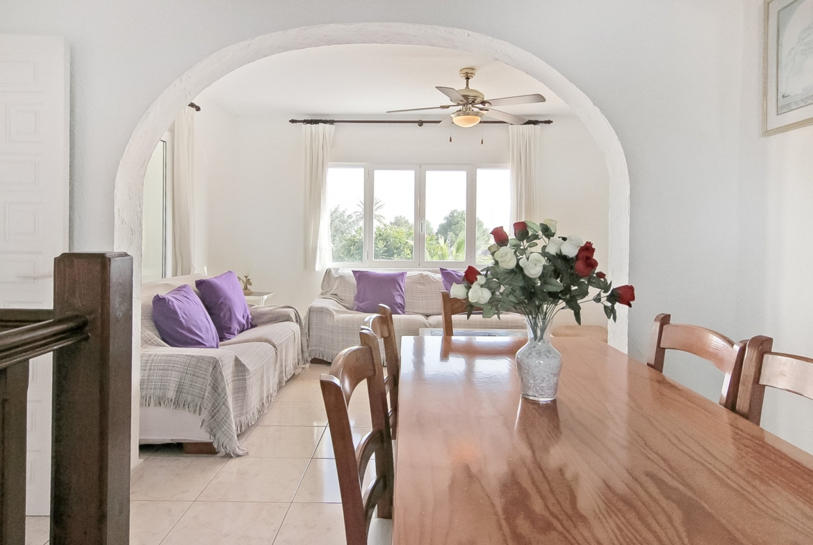 A sliding gate leads to a driveway with parking for two cars. The entrance door leads into a small hallway and on to the lounge/dining room with comfortable sofas, a feature fireplace, air conditioning. The lounge overlooks the pool and has distant sea views. The open plan kitchen has fitted units, fridge/freezer, oven, hob, microwave and dishwasher. On this level are two bedrooms – one double and one twin – both with en-suites with walk-in showers, WC and wash hand basins. Both bedrooms also have fitted wardrobes and air conditioning. The ground floor (pool level) section has a lounge/dining room and open plan kitchen with fitted units, fridge/freezer, oven, hob and washing machine. There are three further bedrooms, on this level – two doubles and one twin – all with en-suites, one with bath with shower over, WC and wash hand basin and the other two with walk-in shower, WC and wash hand basin. All have fitted wardrobes and air conditioning. Outside is a modern 8 meter by 4 meter private pool with Roman style steps. There is a WC and wet room by the pool. The pool is overlooked from a bright conservatory with large windows that open back for a breeze. Inside is a range of eye and base level units with a built-in gas BBQ, oven, hob, sink and fridge/freezer.